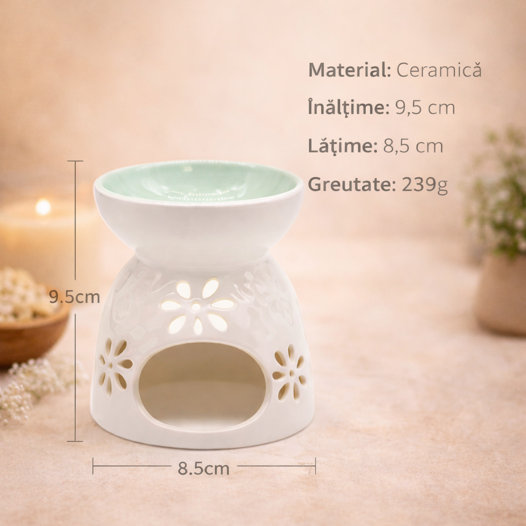 Acest arzator ceramic creeaza un spatiu de liniste, caldura si reconectare interioara, fiind conceput pentru ritualuri de relaxare si aromaterapie constienta. Lumina lumanarii patrunde delicat prin decupajele florale, proiectand umbre blande care induc o stare de calm si siguranta.