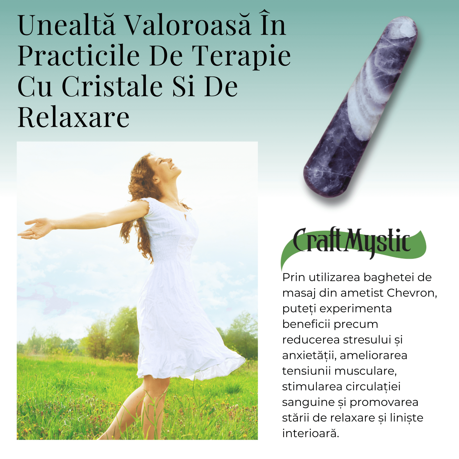 - Utilizare: Potrivita pentru masaj, meditatie sau pur si simplu ca un instrument de relaxare. Bagheta poate fi folosita pentru a aplica presiune in punctele de tensiune, ajutand la relaxarea muschilor si la imbunatatirea fluxului energetic.