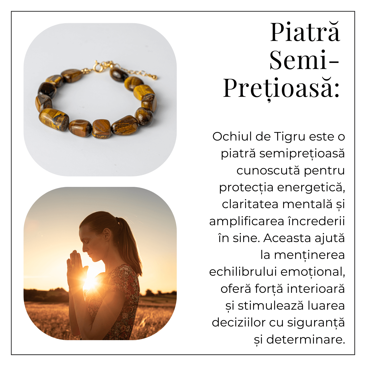 Bijuterie de Echilibru – Ochiul de Tigru este cunoscut pentru puterea sa de a aduce echilibru, protecție și claritate. Este un simbol al stabilității și al încrederii în sine, ajutând la gestionarea energiilor negative și la întărirea intențiilor pozitive.
