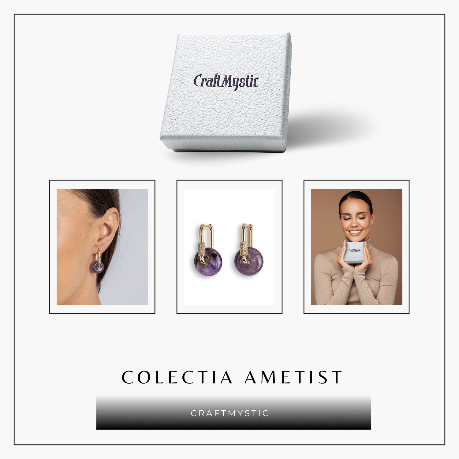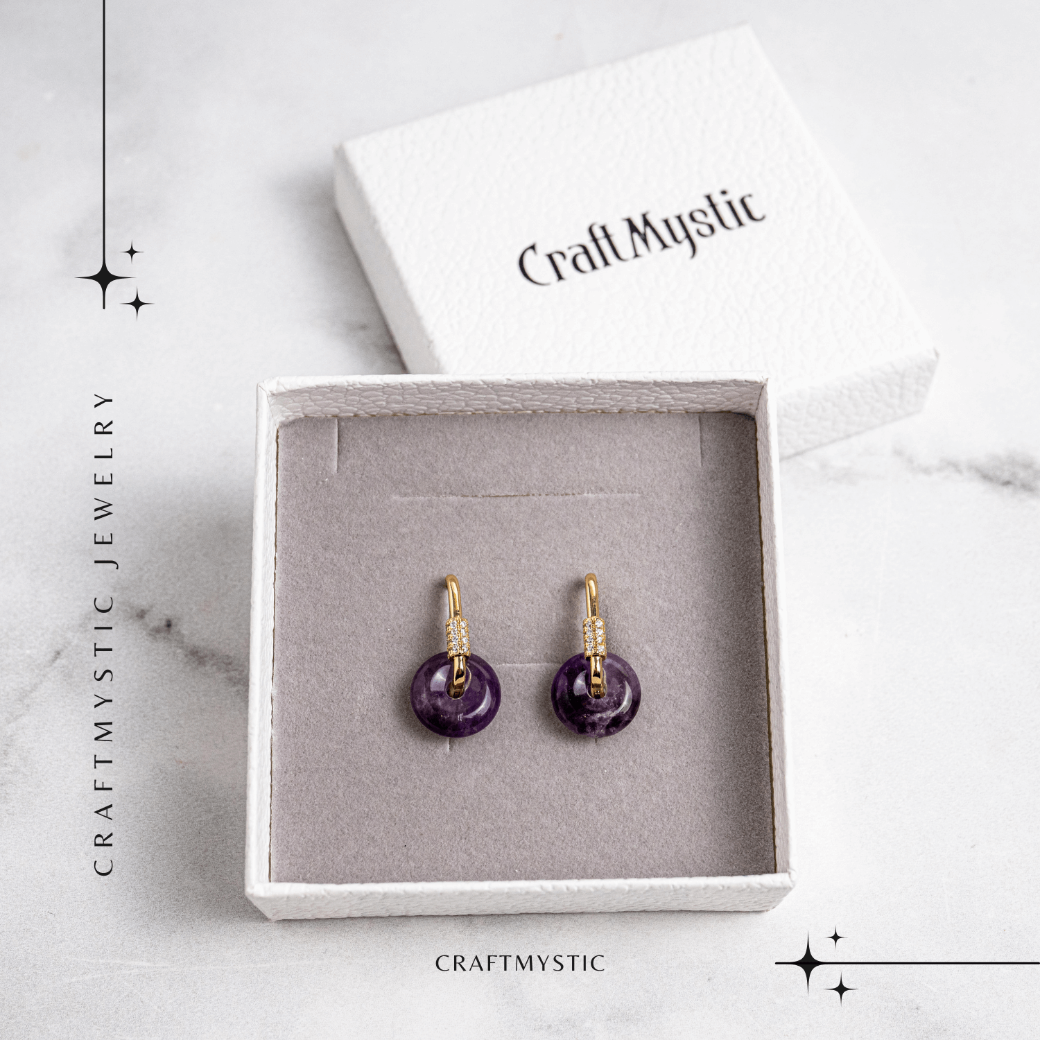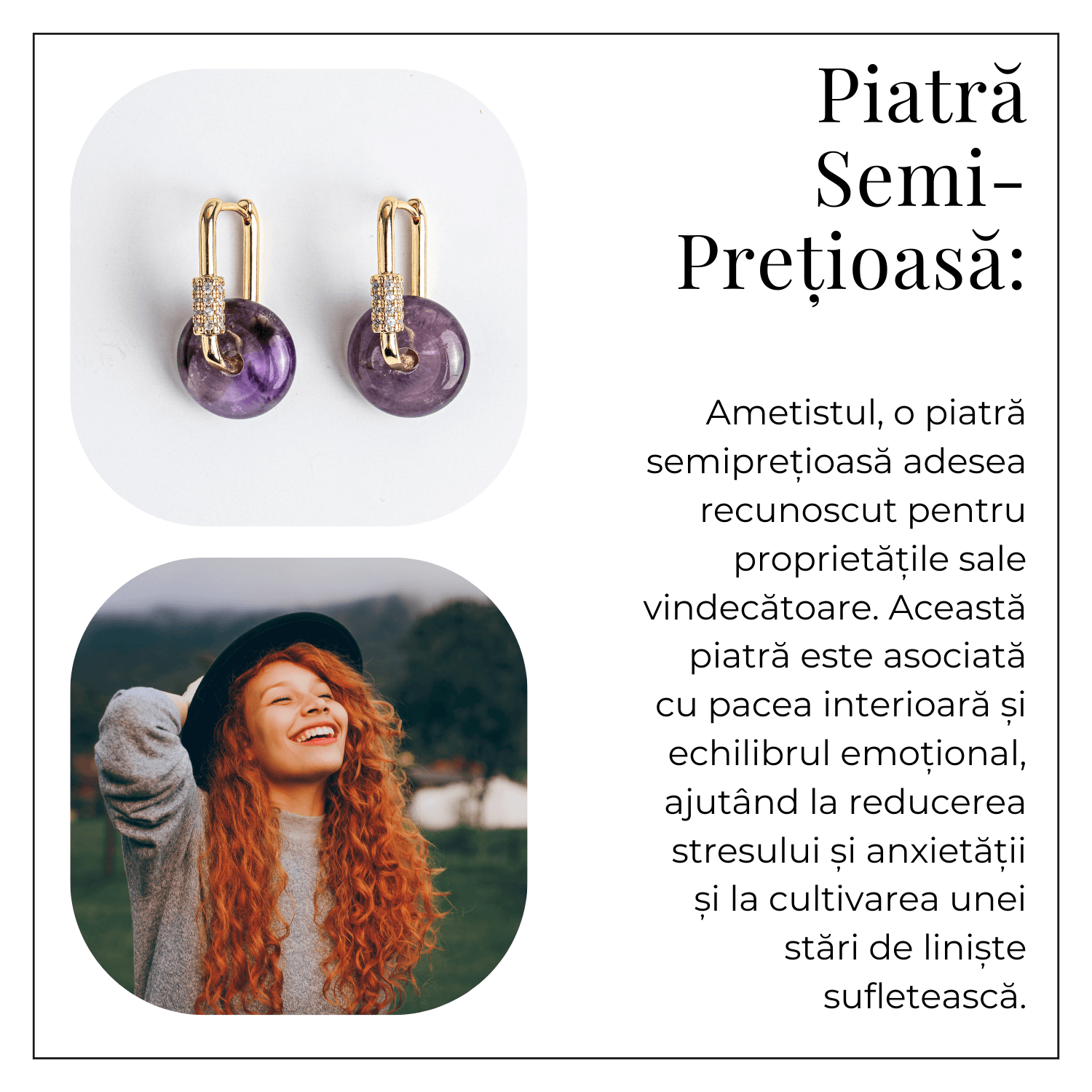 Acești cercei cu Ametist, în formă de Pi, sunt creați pentru a simboliza conexiunea eternă între corp, minte și spirit. Ametistul este cunoscut drept piatra păcii și a transmutării emoțiilor negative în înțelepciune și seninătate. Designul Pi amplifică energia circulară de protecție și stabilitate interioară.