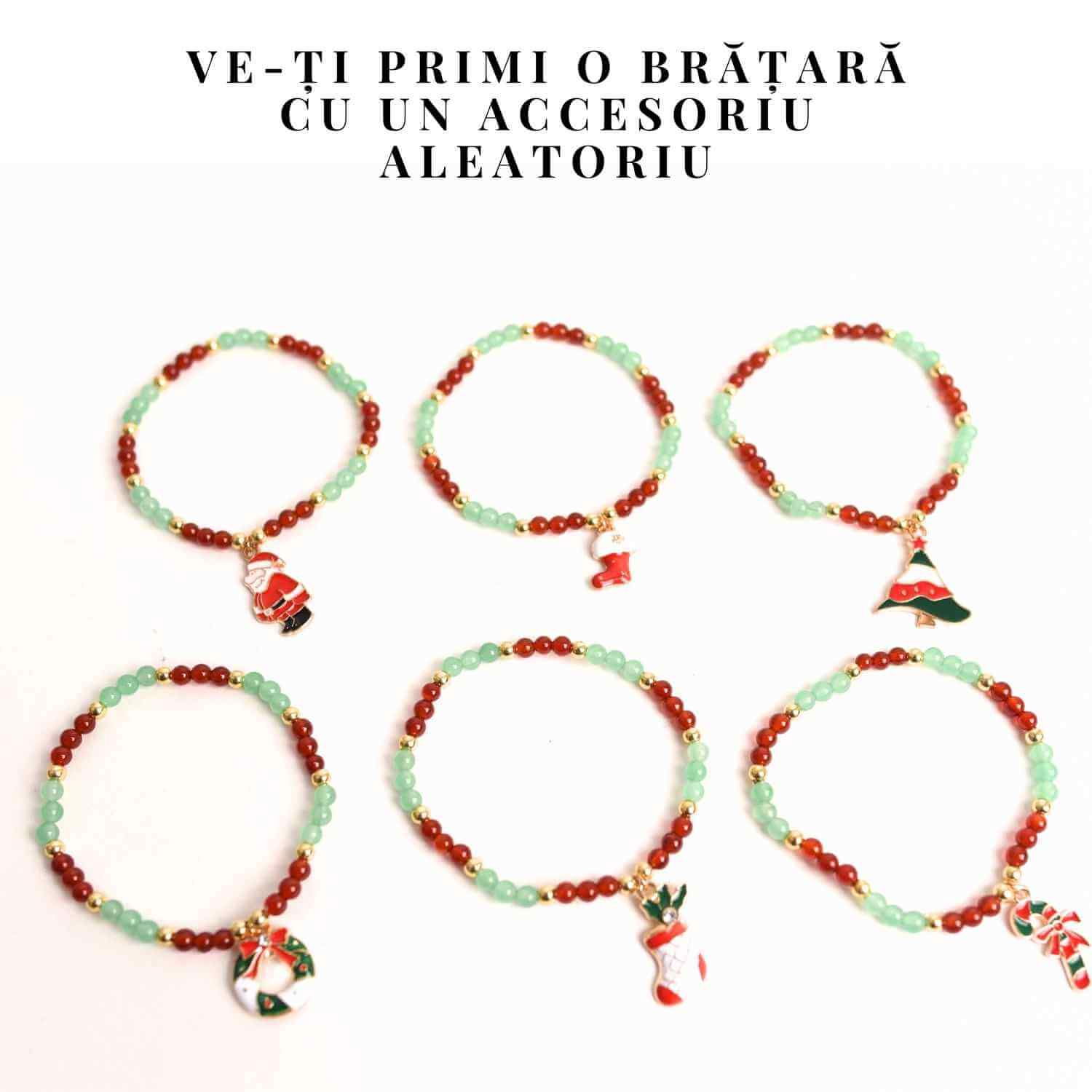- Pandantive mix: Fiecare brățară include un pandantiv aleatoriu (Moș Crăciun, clopoțel, brăduț, semilună etc.).