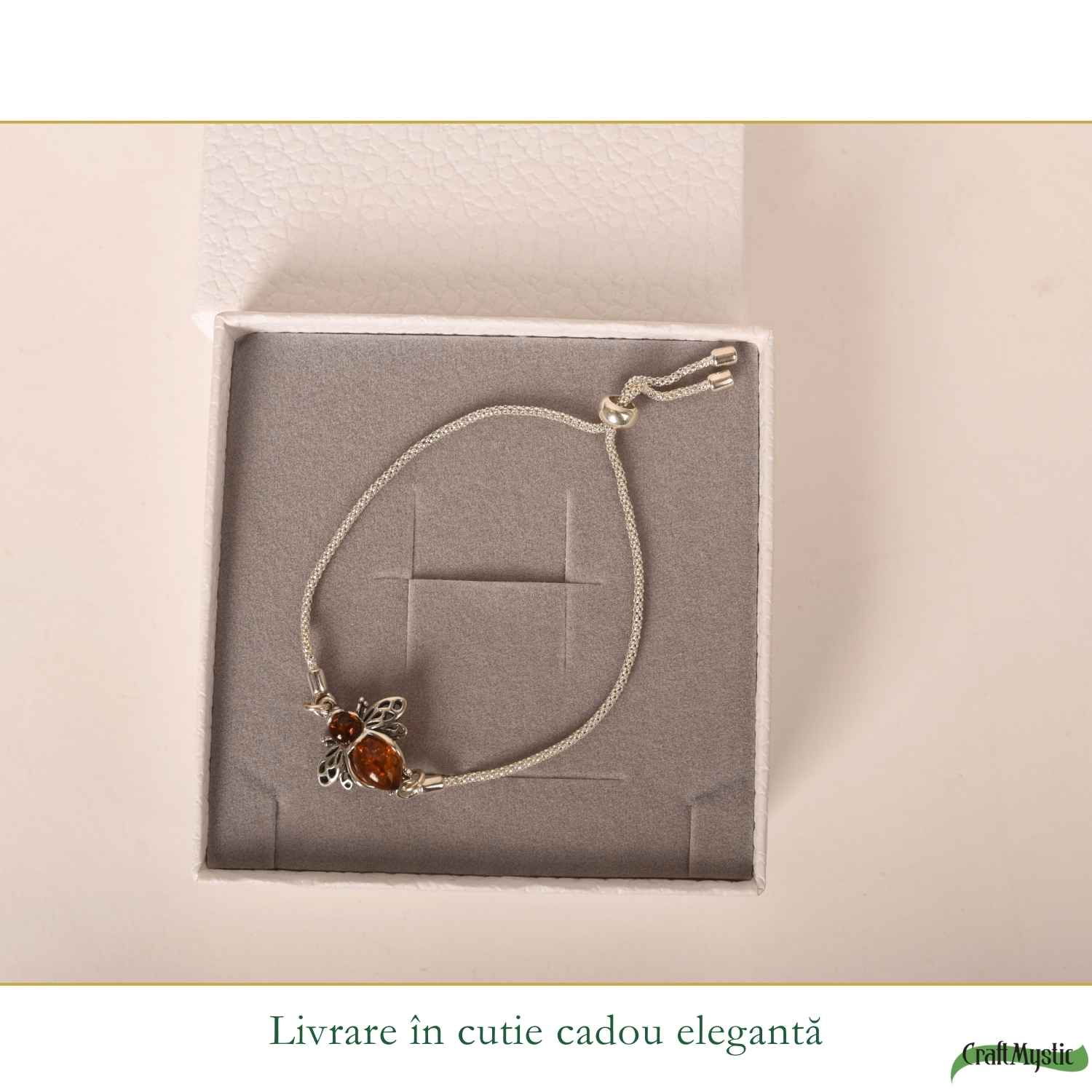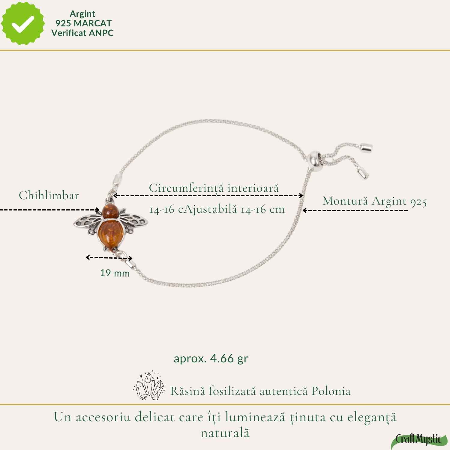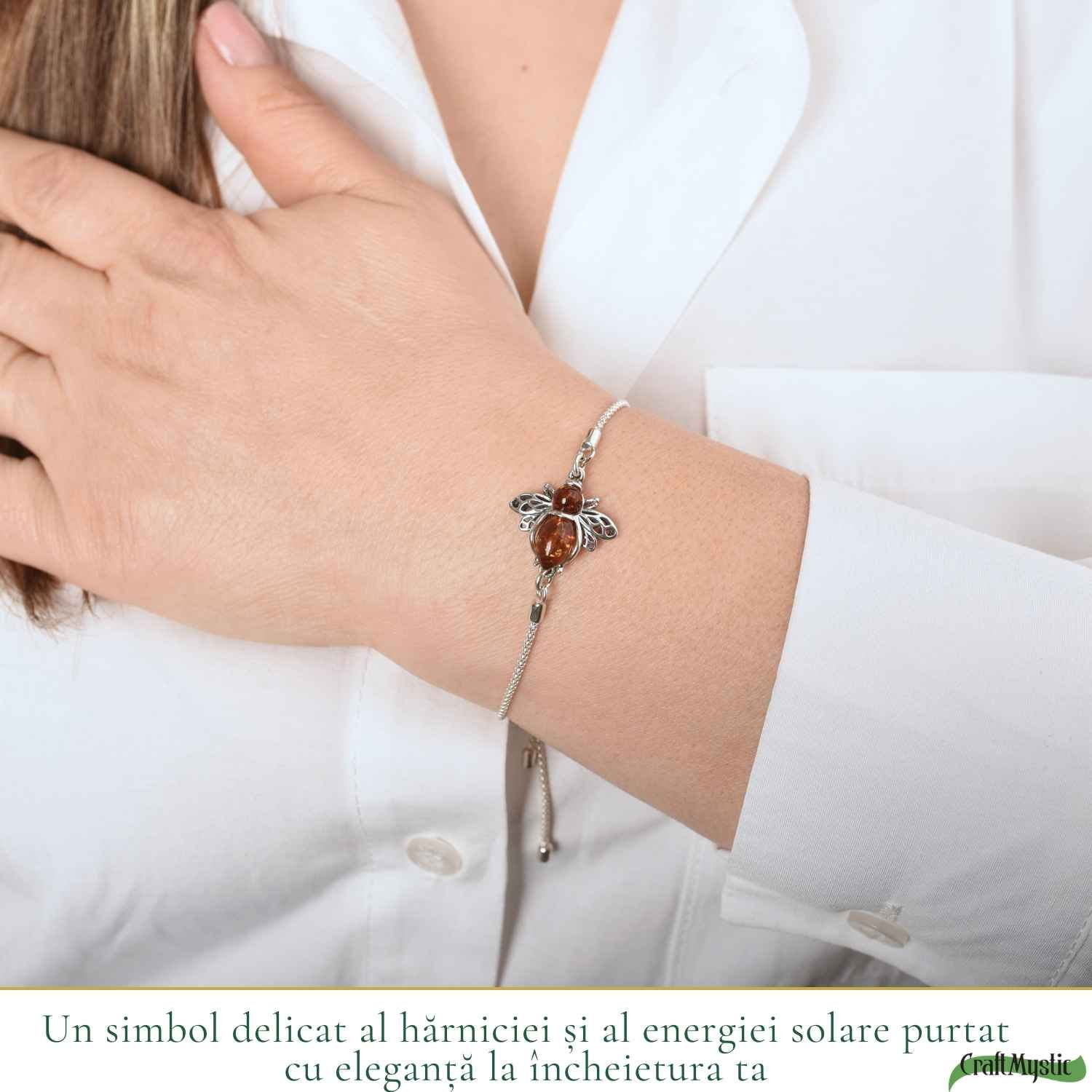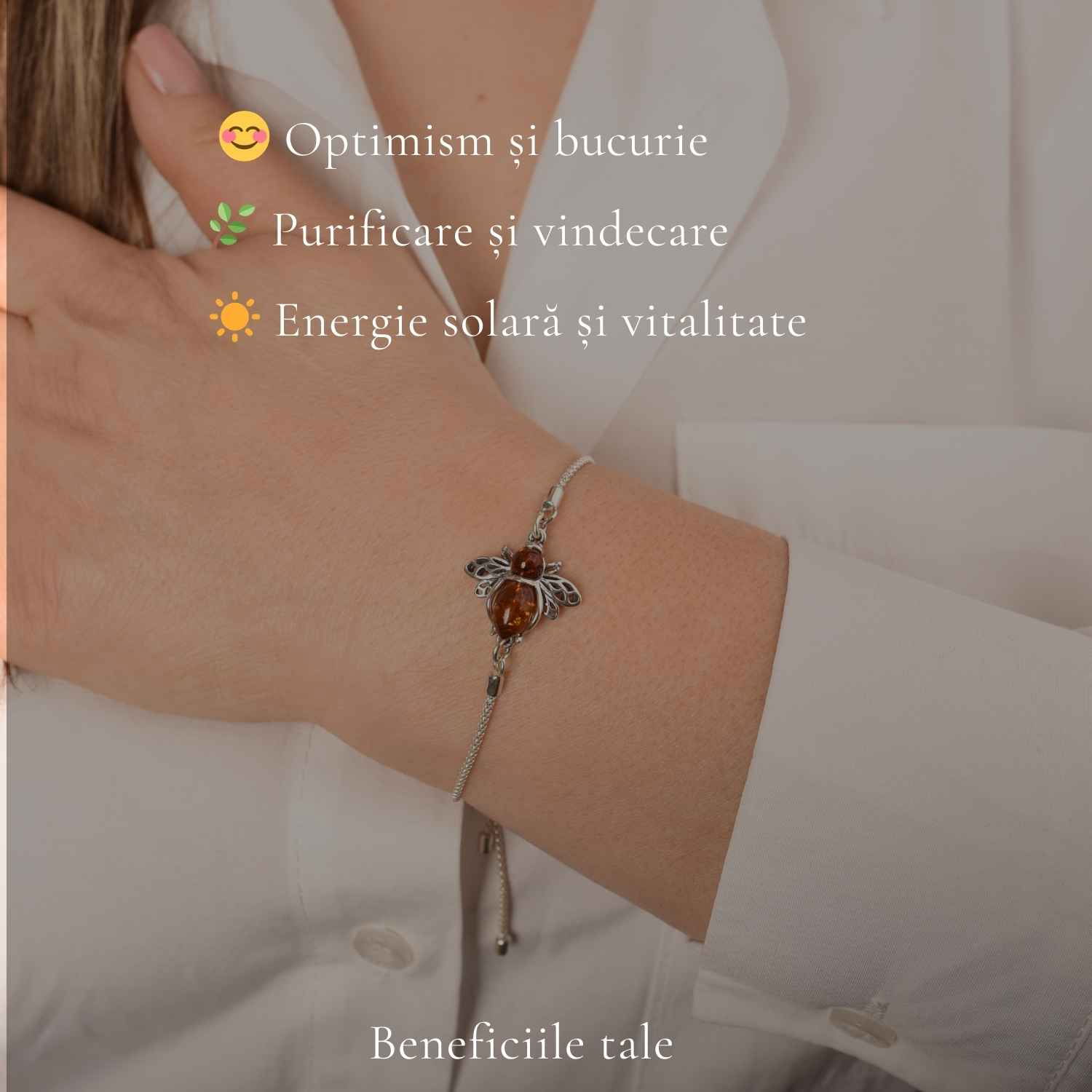 În această brățară, chihlimbarul natural pune în valoare simbolul albinei – mesager al hărniciei, comunității și prosperității.