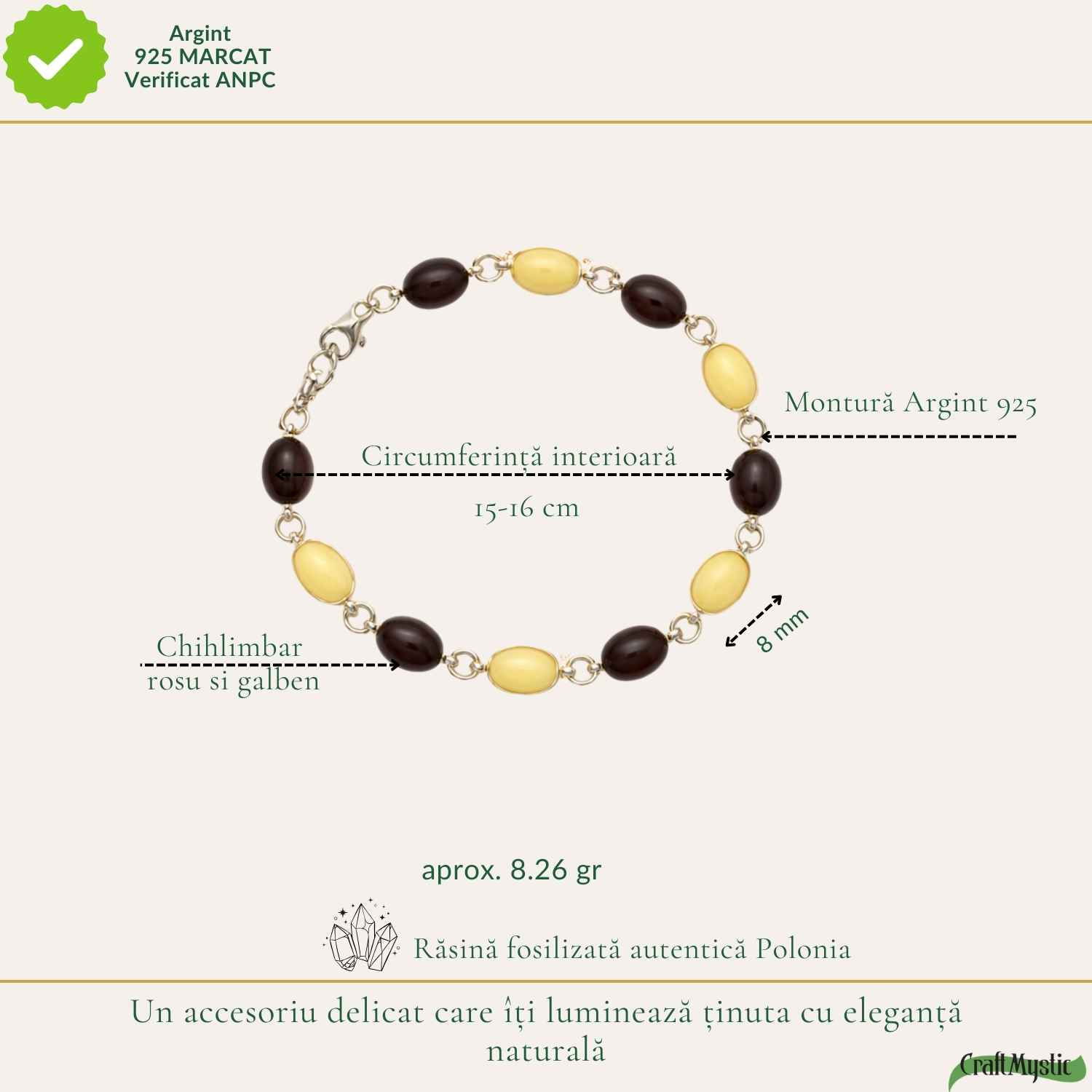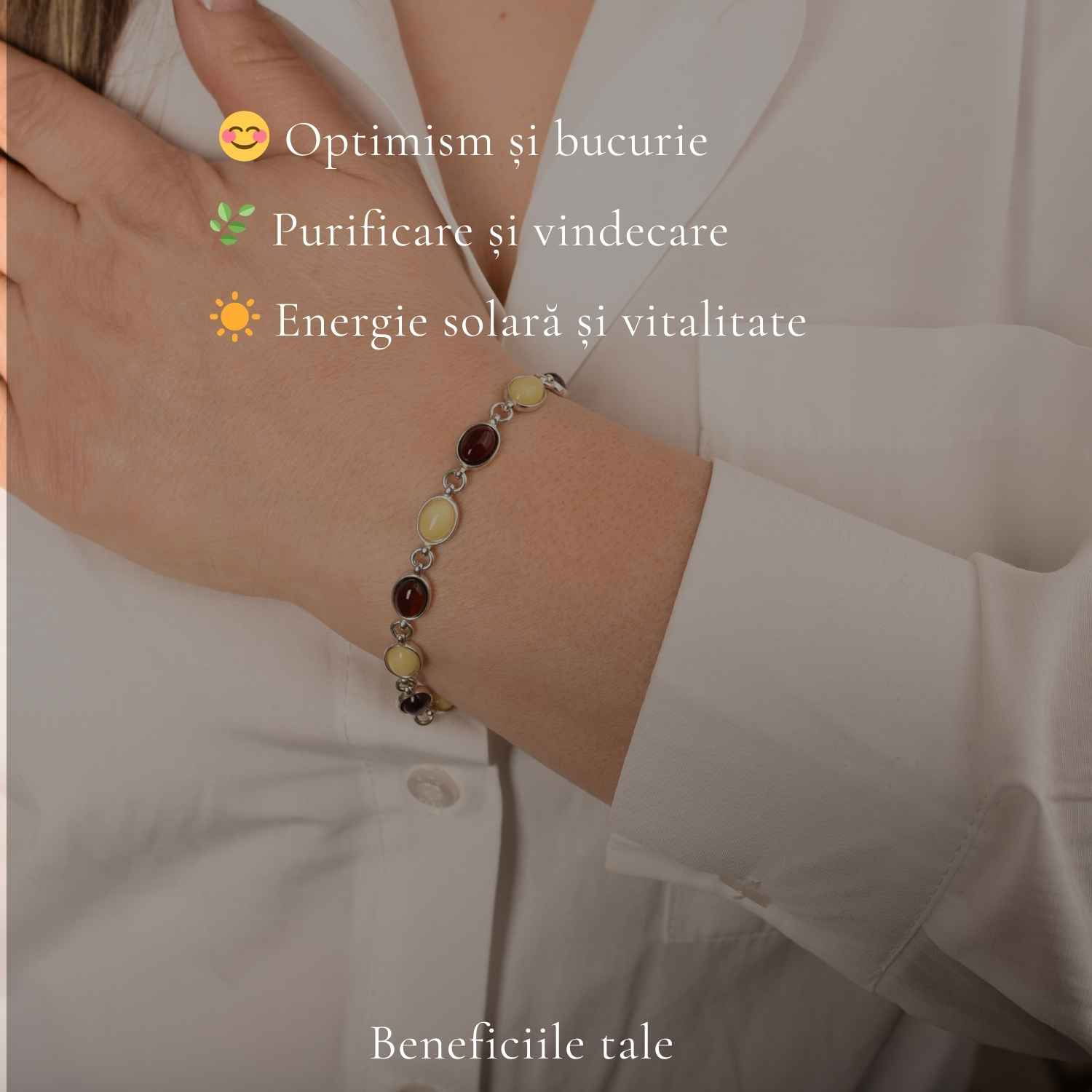 Brățara aceasta cu chihlimbar galben și roșu îți îmbracă mâna în nuanțe de miere și cognac, cu o eleganță naturală și discretă.