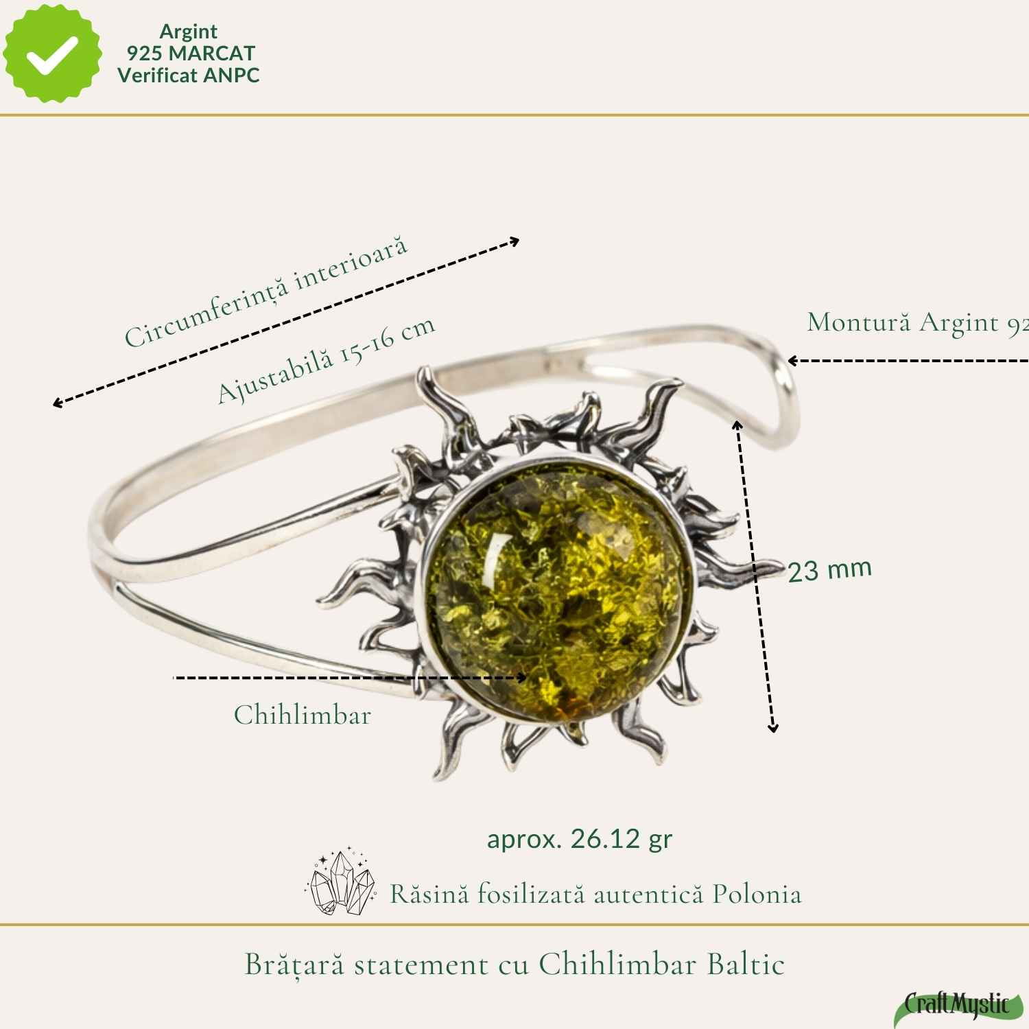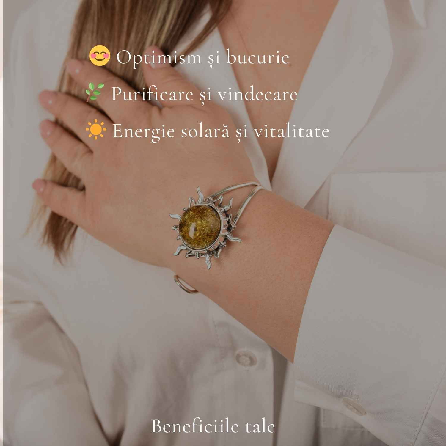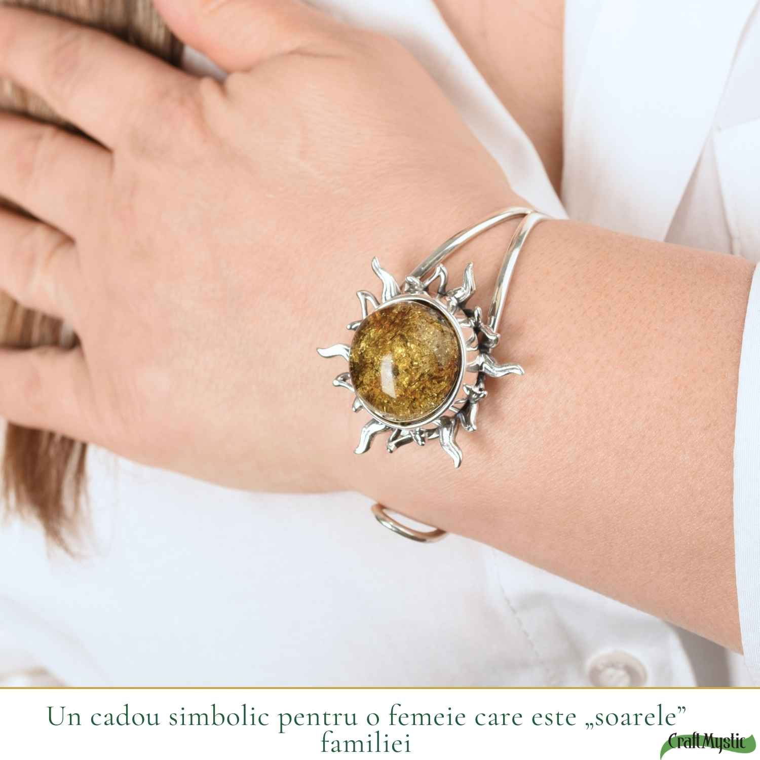Această brățară cu chihlimbar verde în formă de soare este despre forță, feminitate și curajul de a străluci.