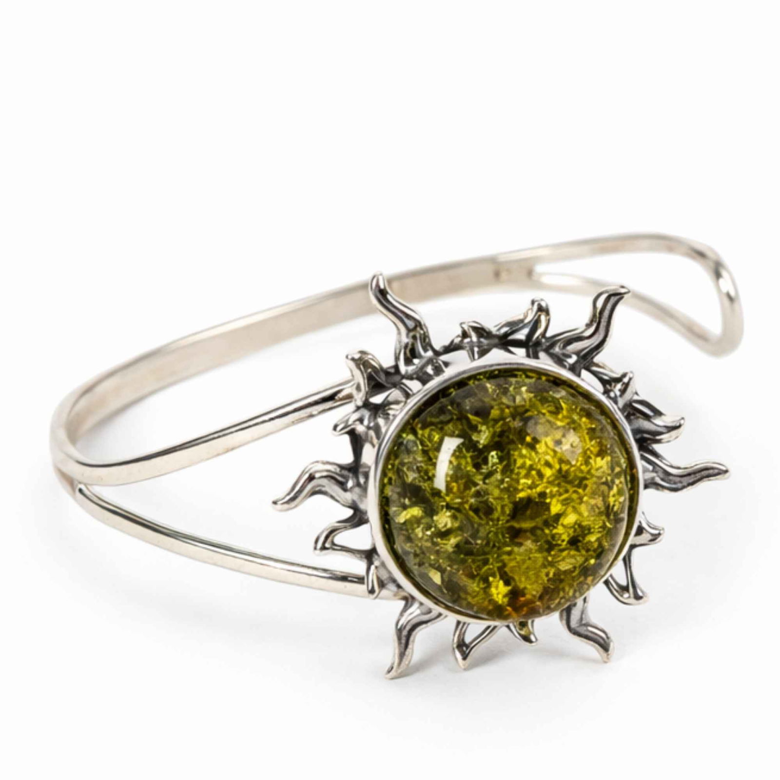 Brățară din argint 925 cu chihlimbar verde natural în formă de soare, o piesă statement plină de lumină și forță. Solidă (26.12 g), o simți pe mână ca pe un simbol al energiei și al încrederii tale. 💚☀️✨