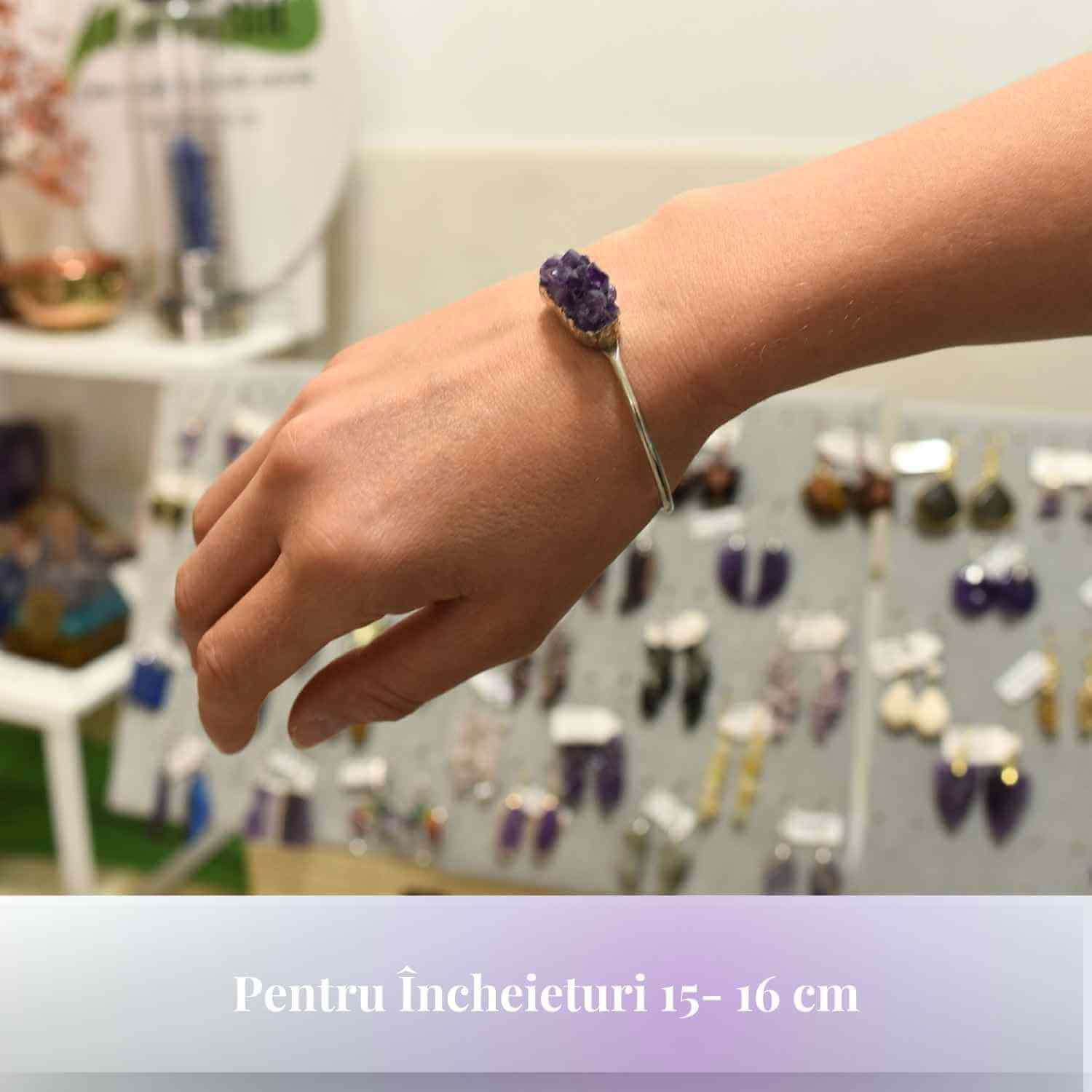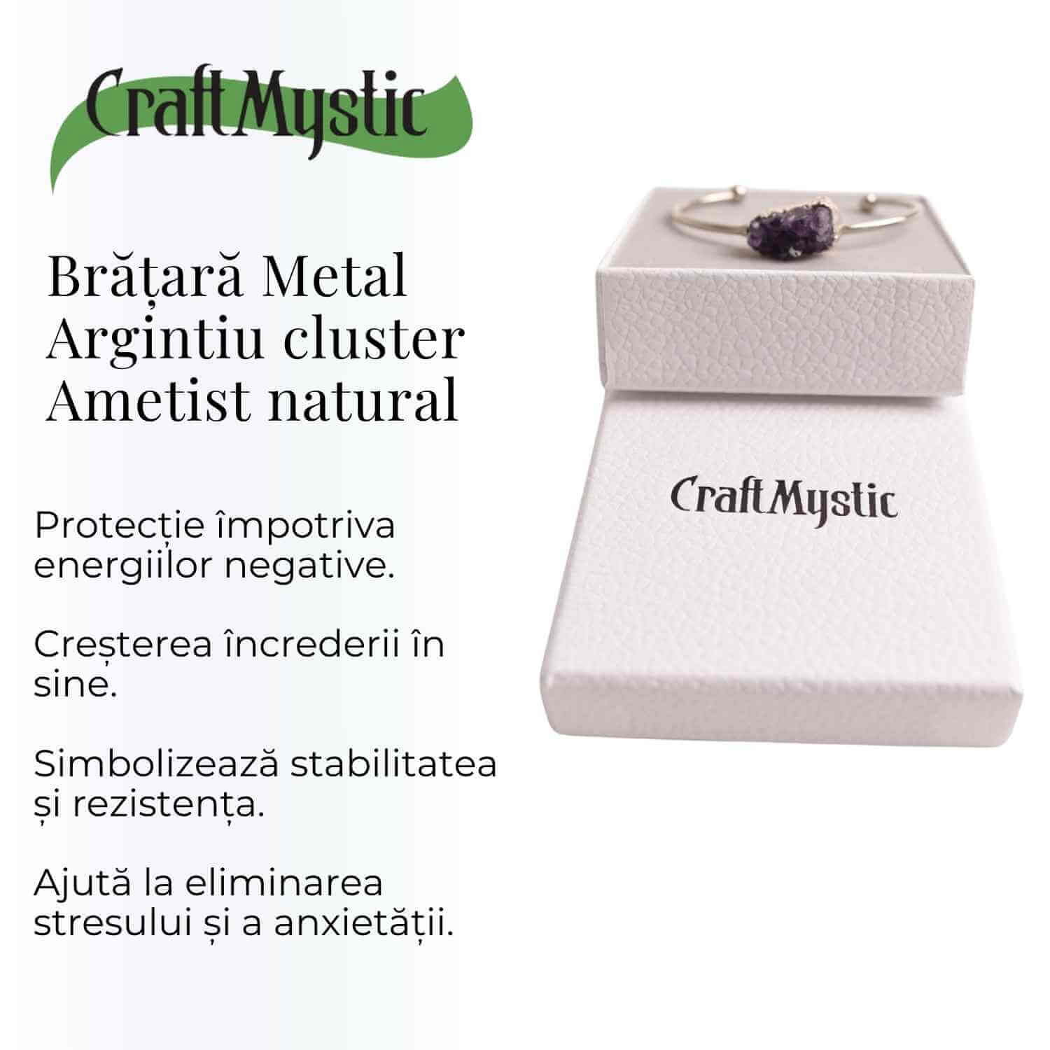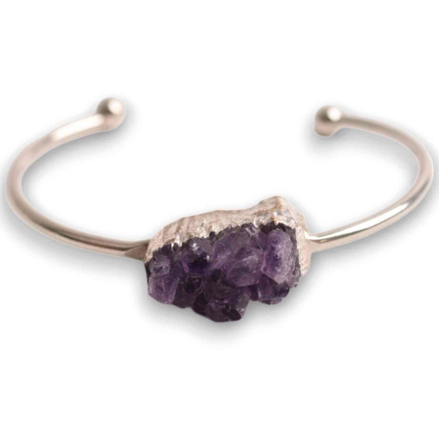 Descoperă echilibrul și frumusețea cu noua noastră brățară de ametist. Designul său elegant și piatra prețioasă naturală oferă nu doar un accesoriu de efect, ci și un aliat pentru liniștea ta zilnică. Poartă această brățară argintie cu piatră naturală ovală din cluster de ametist pentru a te bucura de beneficiile sale multiple: