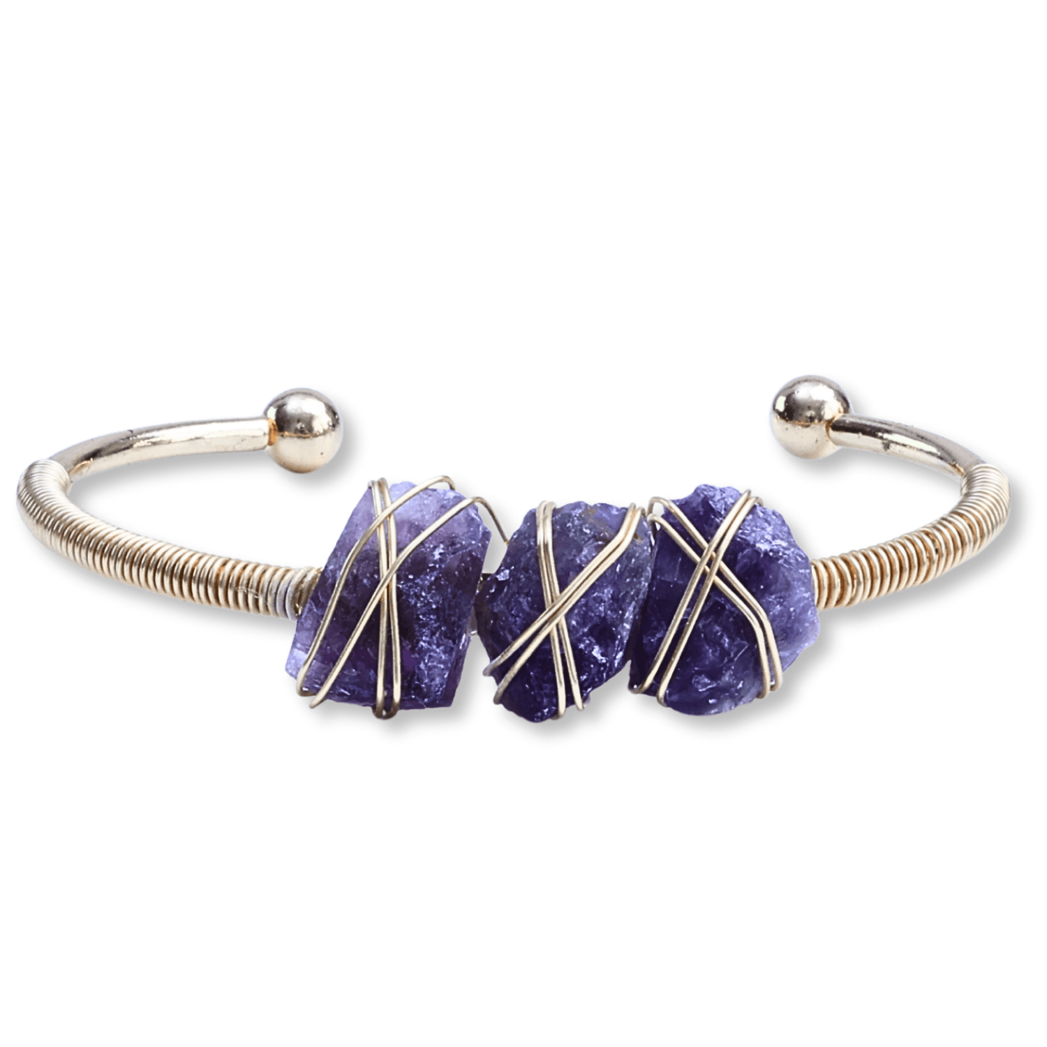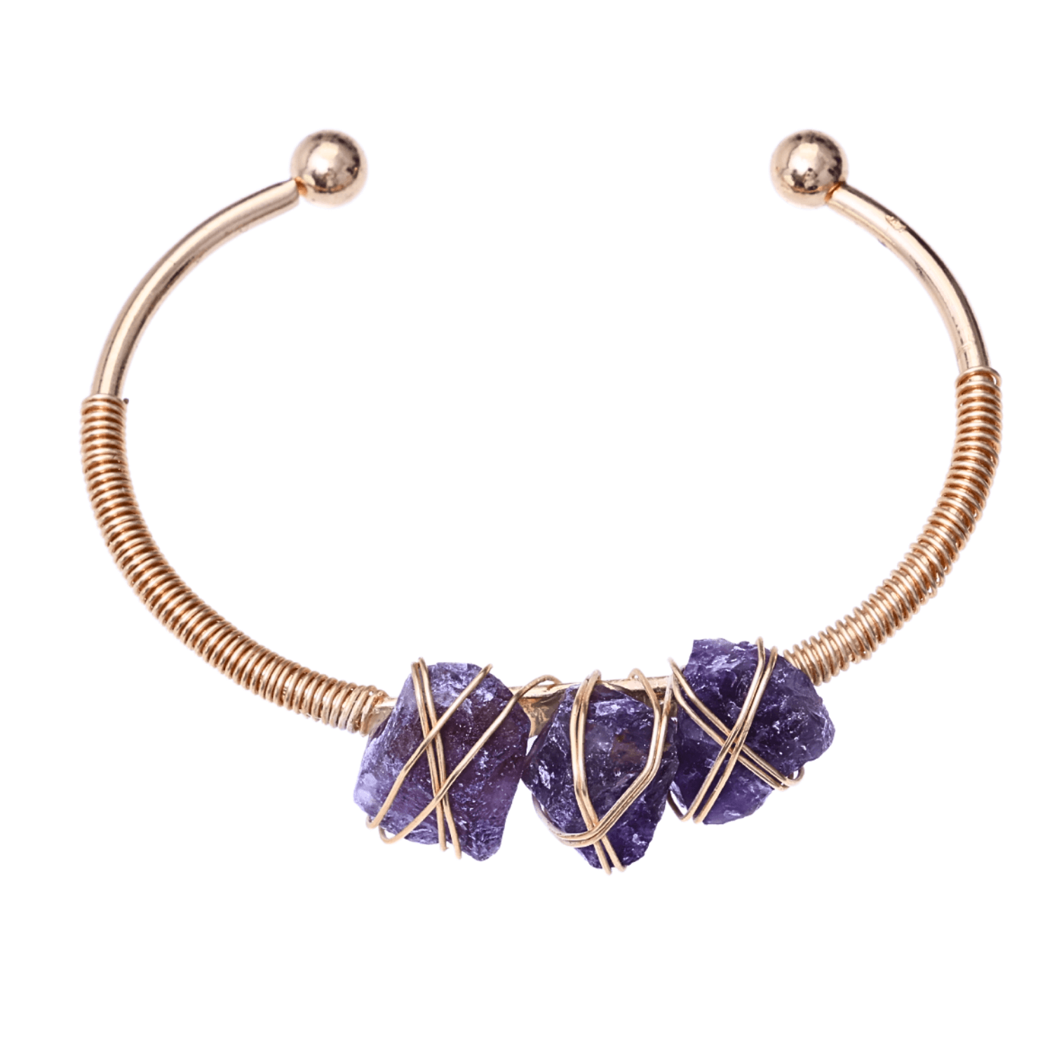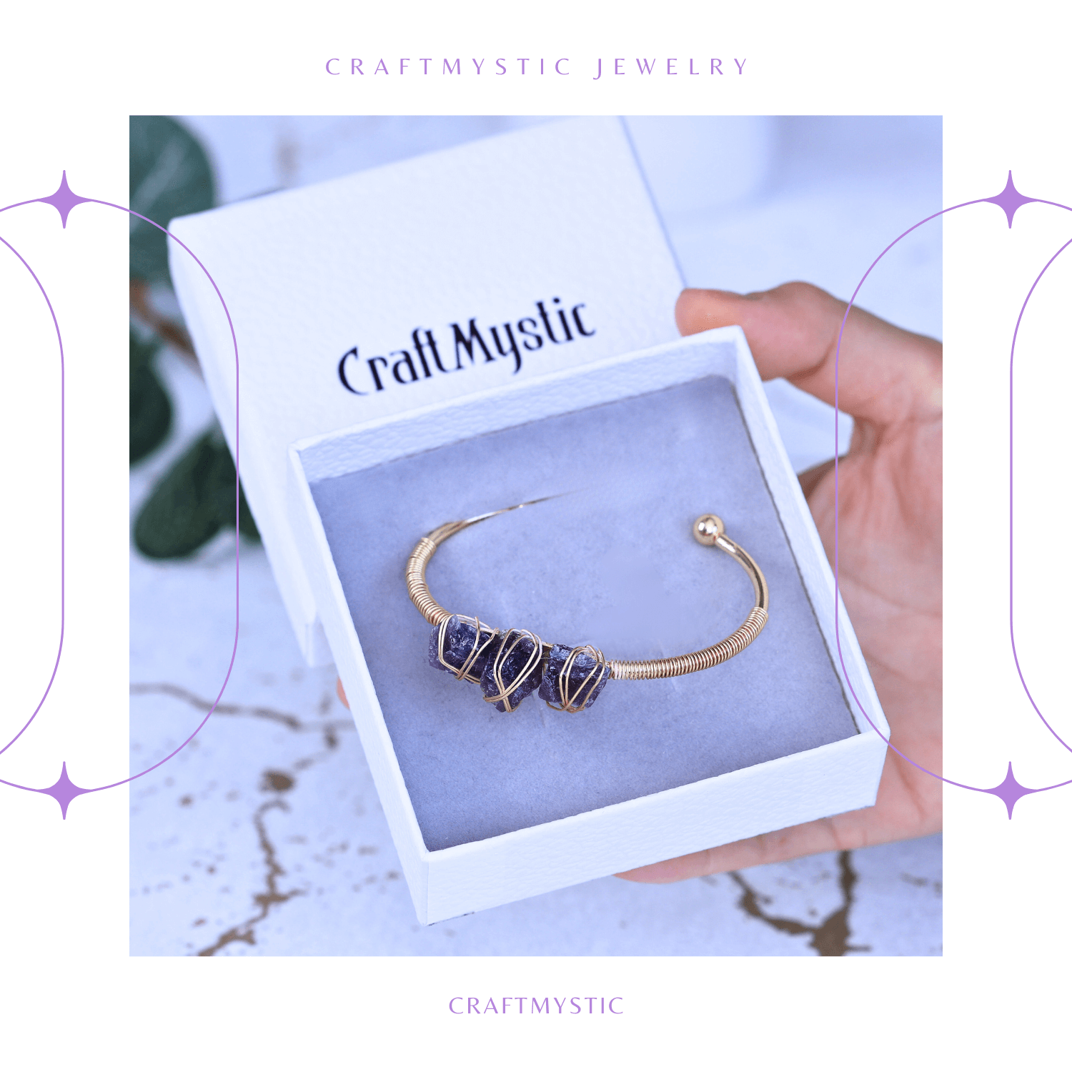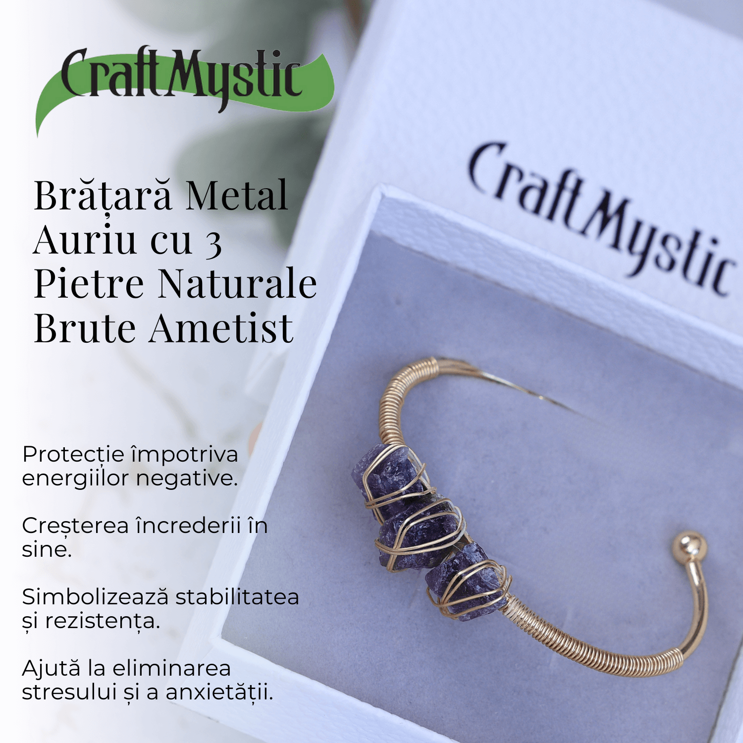 Această brățară din metal auriu rezistent la oxidare este decorată cu trei pietre naturale brute de ametist, simbolizând echilibrul și protecția. Dimensiunea totală a pietrelor este de 3 cm, iar circumferința interioară a brățării este de 15-16 cm, perfectă pentru majoritatea încheieturilor.