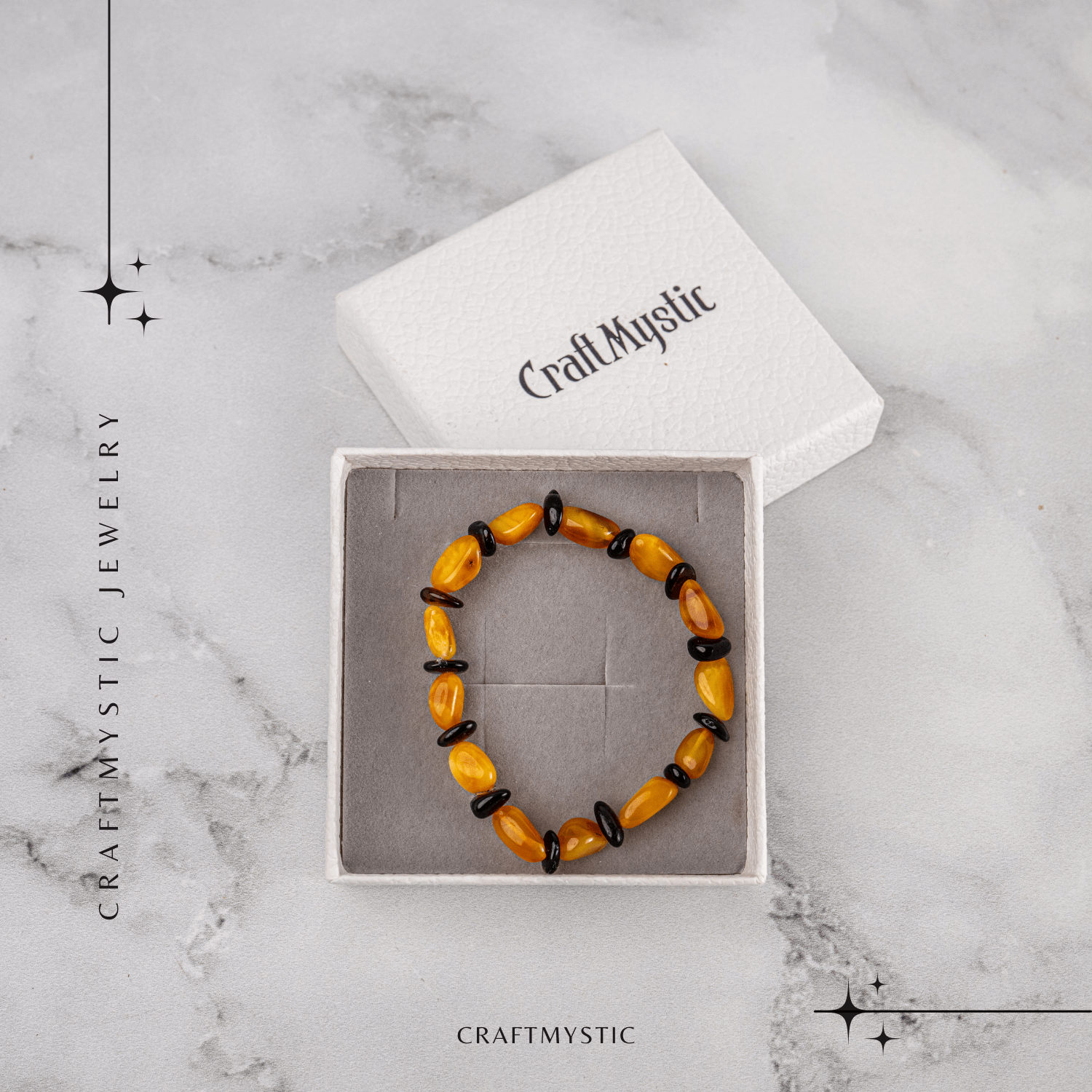 Poartă această brățară ca pe o rază de soare purtată la încheietură. Chihlimbarul îți încălzește sufletul, îți aduce claritate și te înconjoară cu energie naturală, luminoasă, ca un talisman al echilibrului interior.