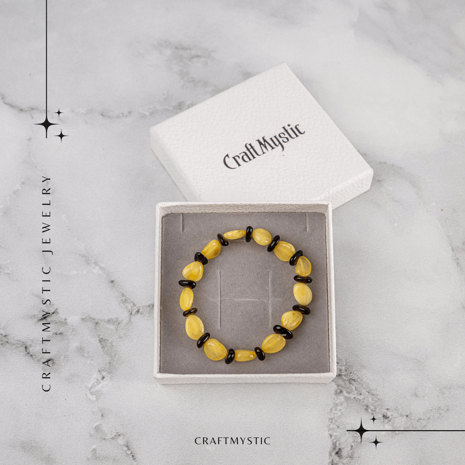 Aceasta bratara din chihlimbar natural, in nuante calde de galben luminos si maro-rosiatic profund, poarta energia soarelui si stabilitatea pamantului intr-o singura bijuterie organica.