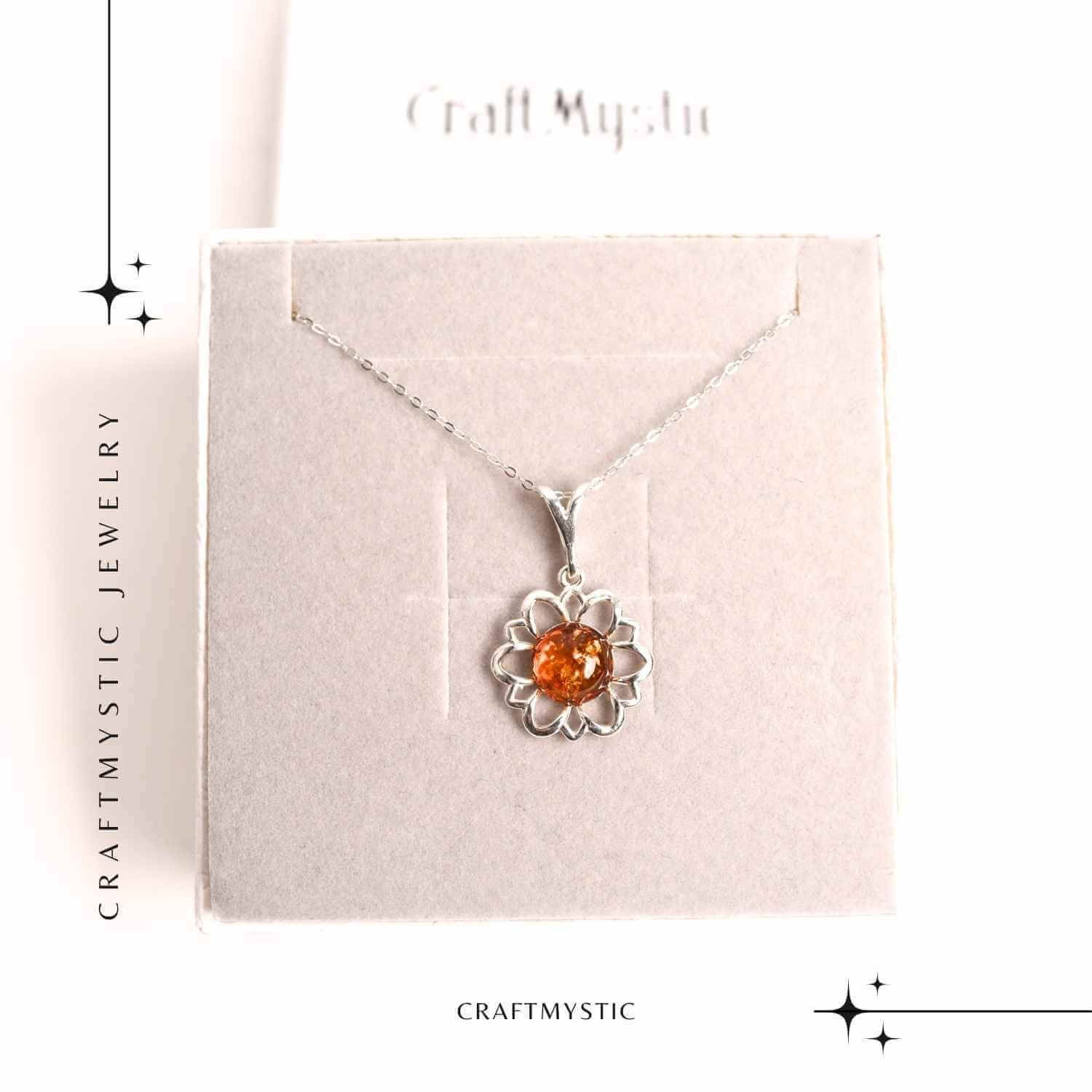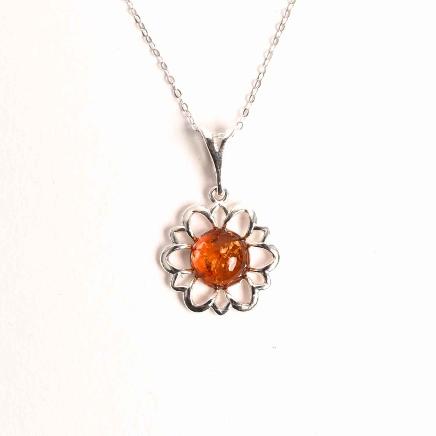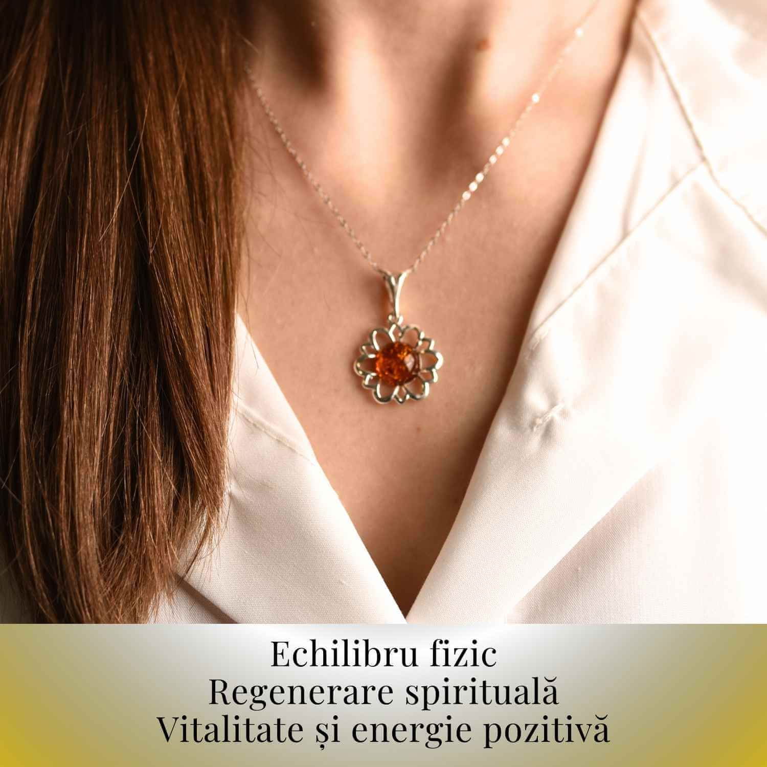 Un colier incredibil de elegant, cu pandantiv în formă de floare din chihlimbar natural și argint 925 – simbol al grației și rafinamentului.