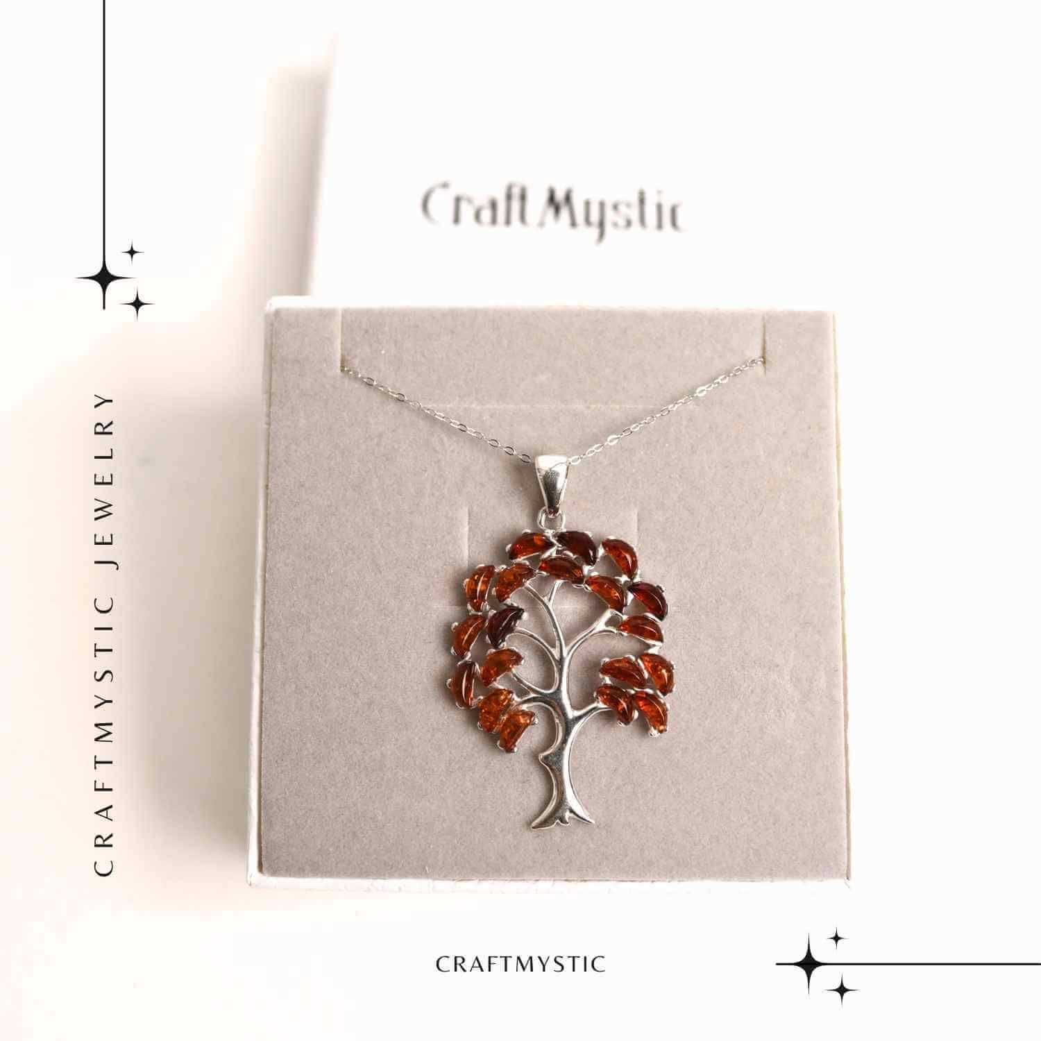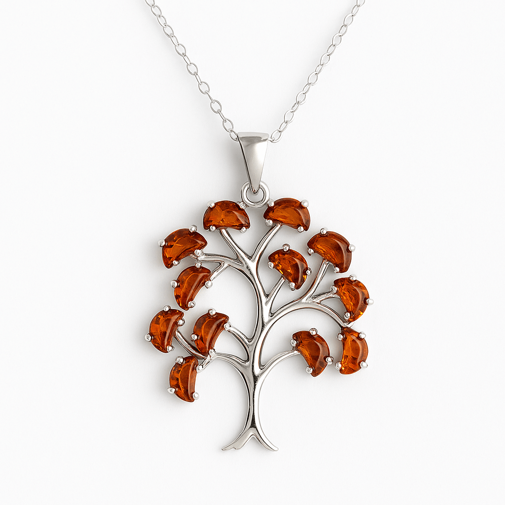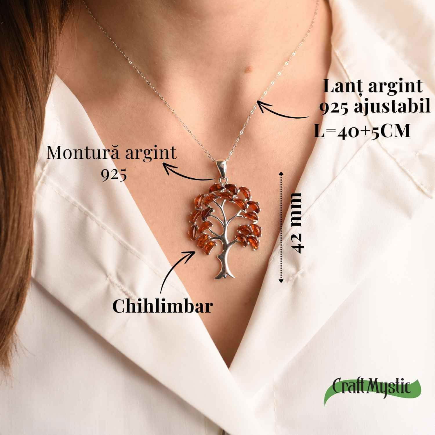 Colier din argint 925 cu piatră naturală de chihlimbar, în formă de copacel: O bijuterie elegantă și plină de semnificație, ce combină energia vindecătoare a chihlimbarului cu simbolistica profundă a copacului vieții. Cu un pandantiv de aproximativ 42 mm și un lanț ajustabil (40+5 cm), acest colier reprezintă o alegere ideală pentru cei care apreciază natura și spiritualitatea. Fiecare piesă este lucrată manual, având variații subtile care subliniază unicitatea produsului.