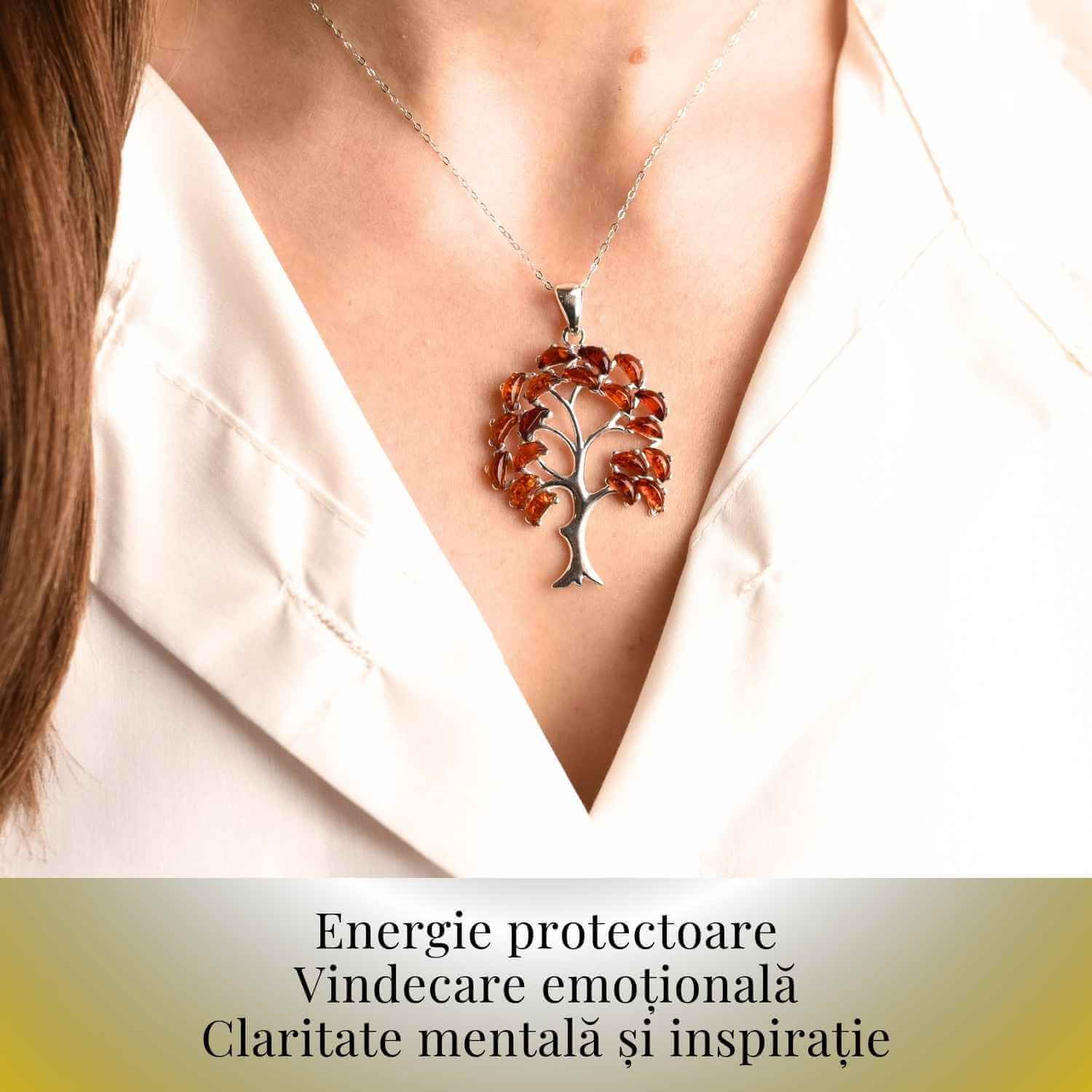 Un colier unic cu pandantiv în formă de copacel, lucrat manual din chihlimbar natural și argint 925 – simbol al echilibrului și regenerării.