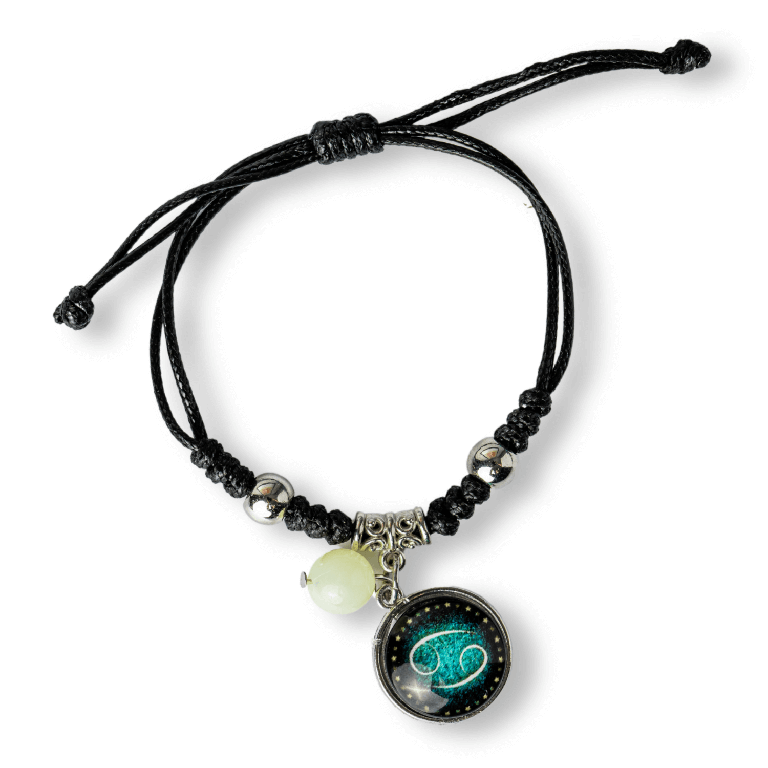 Bratara Zodia Rac Ajustabila din Sfoara Cerata si Piele Sintetica - Cabochon Rotund cu Semn Zodiacal si Bila Fosforescenta