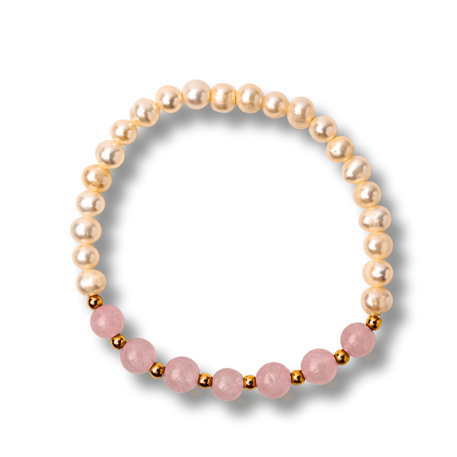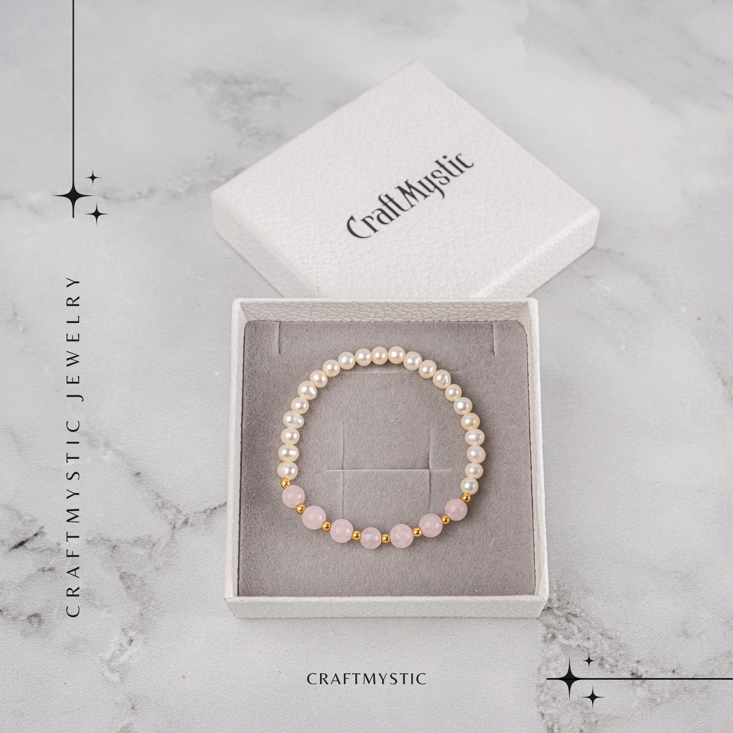 Poartă această brățară ca pe o declarație de iubire față de tine însăți. Cuartul Roz îți mângâie sufletul cu blândețe, iar perlele îți luminează feminitatea, amintindu-ți că delicatețea este o forță profundă și frumoasă.