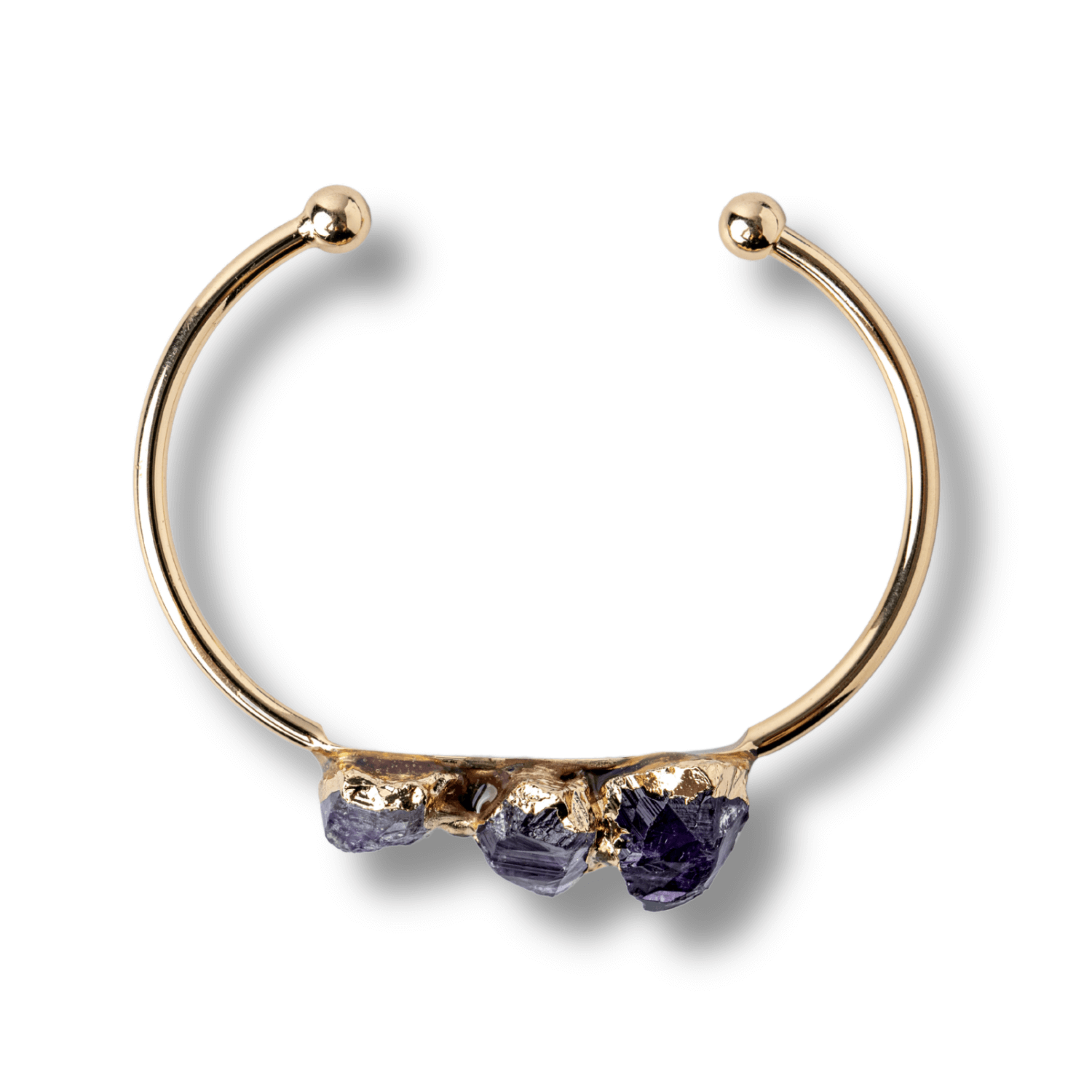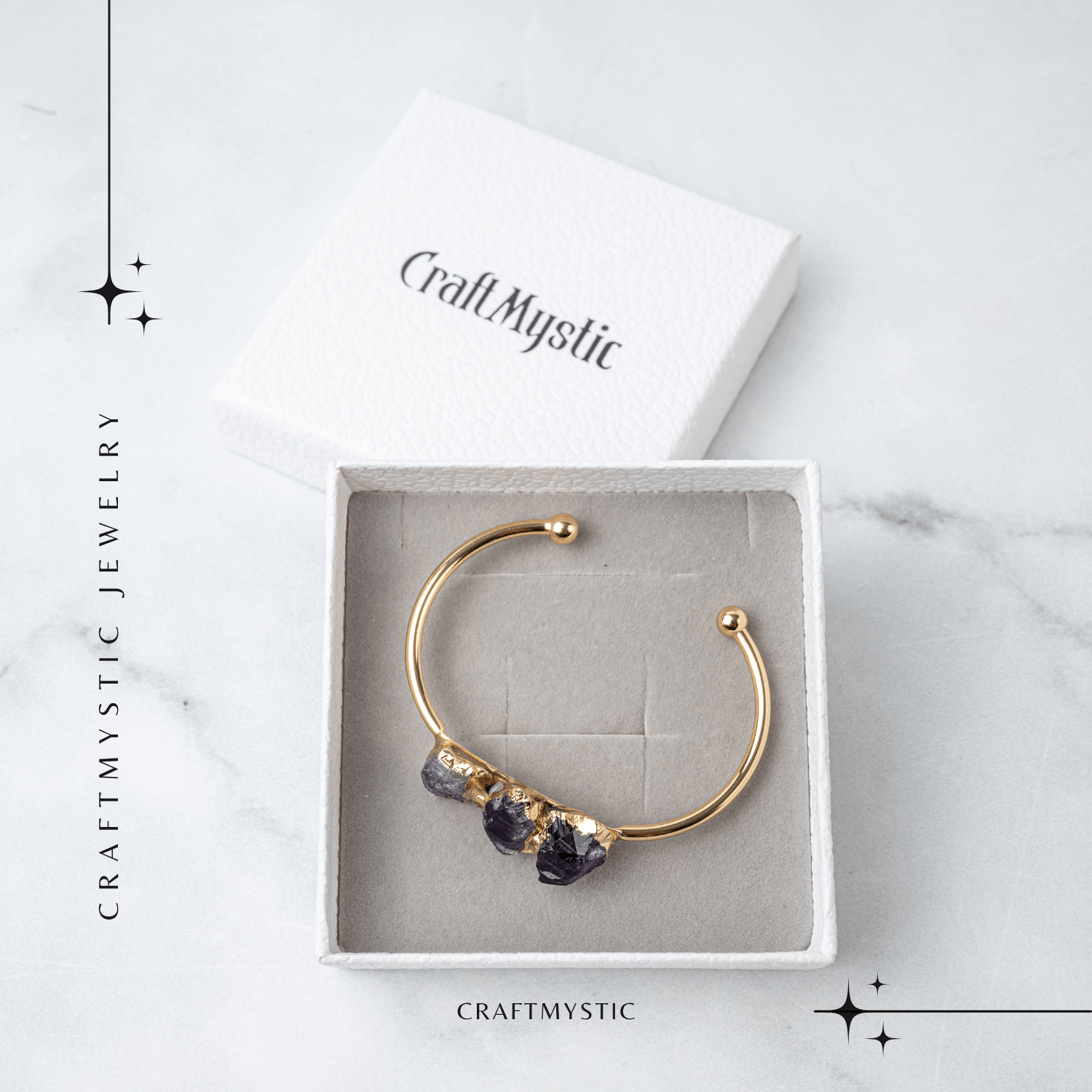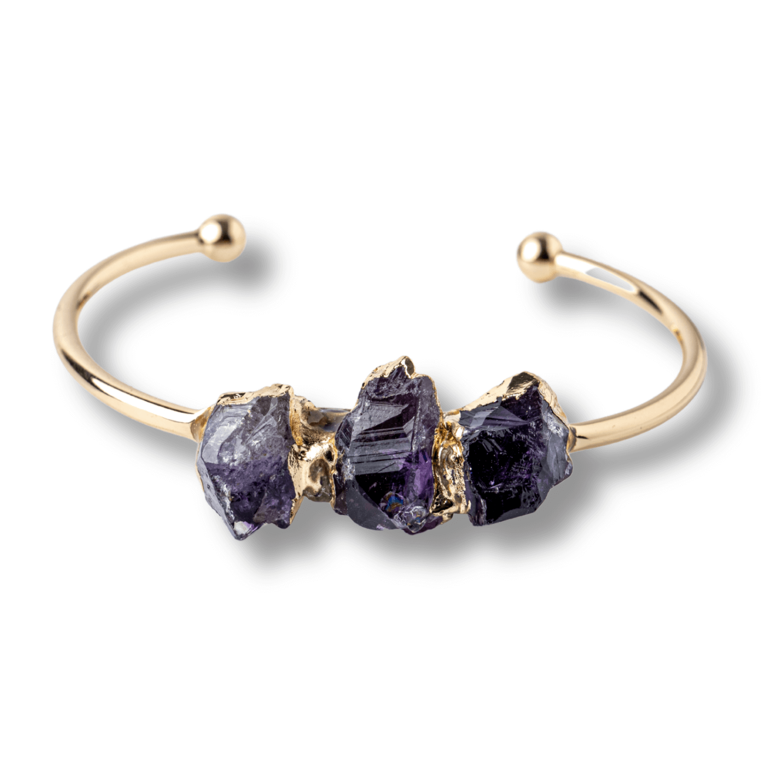 Aceasta bratara rafinata, realizata din cupru si decorata cu trei cristale naturale de ametist brut, emana o energie pura si echilibranta. Ametistul, piatra luminii si a claritatii mentale, este considerat un aliat spiritual puternic ce sustine calmul interior, intelepciunea si armonia. Designul minimalist, dar impunator, pastreaza frumusetea naturala a cristalului, conferind bijuteriei o vibratie autentica si profunda.