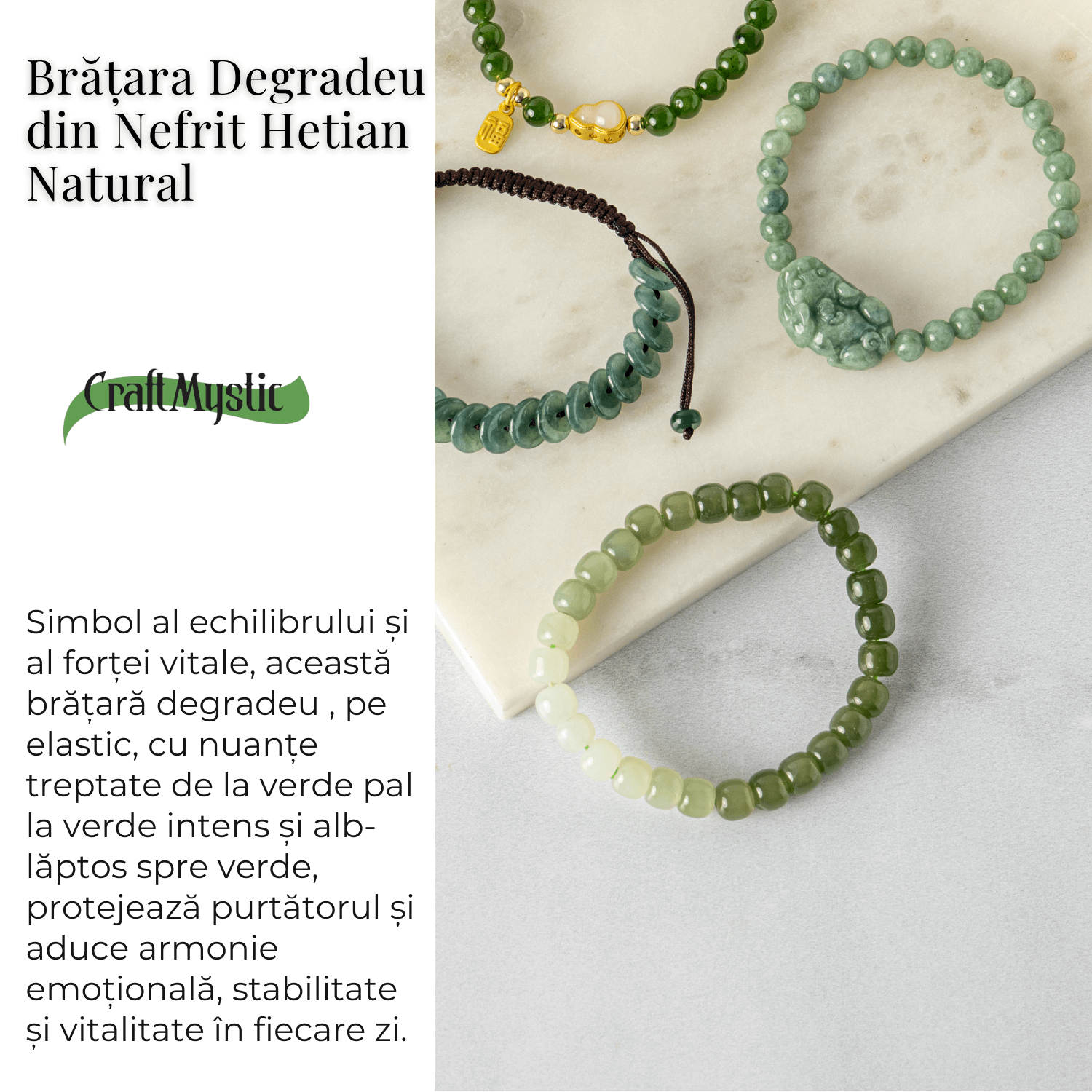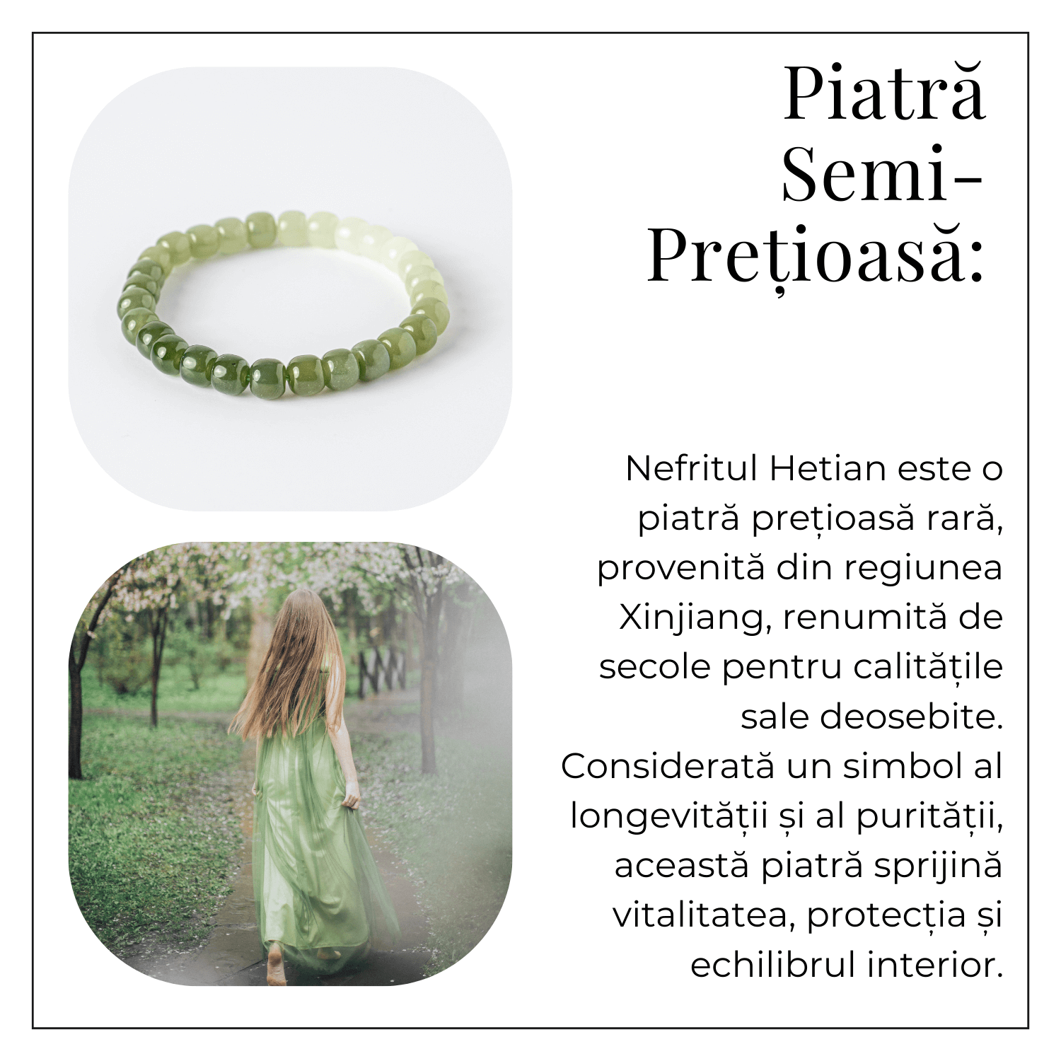 Aceasta bratara din Nefrit Hetian Natural, lucrata in nuante de verde pal pana la verde intens, este un simbol al echilibrului, vitalitatii si protectiei interioare. Forma sa circulara sugereaza ciclicitatea vietii, armonia si continuitatea, iar piatra de nefrit este considerata de mii de ani un talisman al longevitatii si al pacii sufletesti.