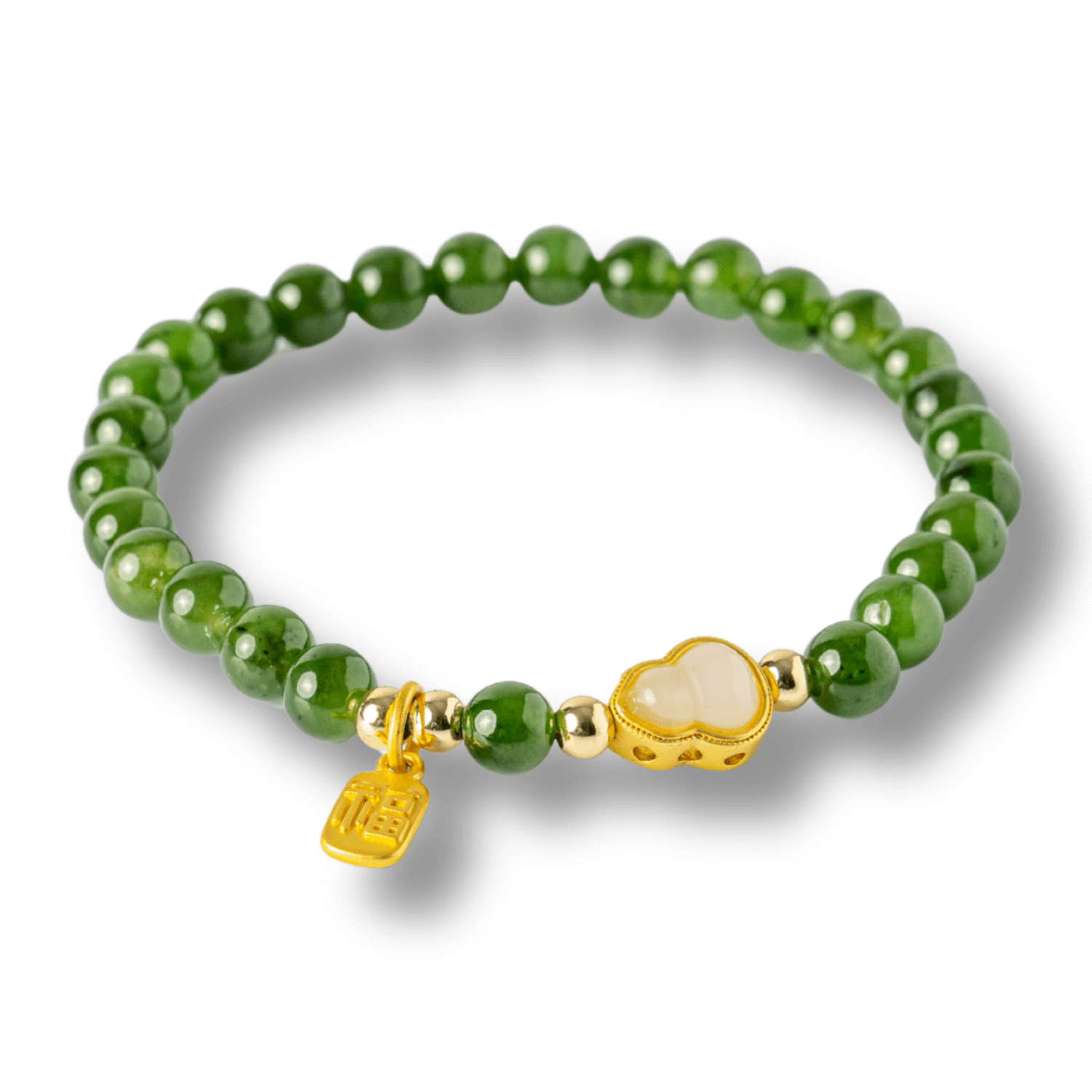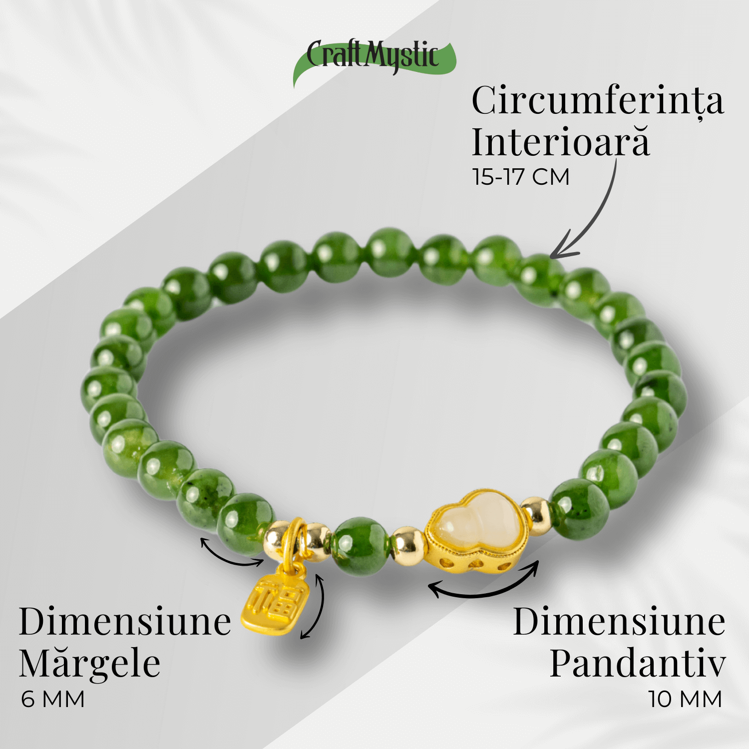 Această brățară elegantă, realizată din jasp verde natural și înfrumusețată cu un pandantiv delicat din nefrit Hetian, simbolizează armonia dintre forța naturii și echilibrul interior. Verdele intens al jaspului rezonează cu vitalitatea și regenerarea, iar nefritul Hetian adaugă protecție și energie purificatoare. Pandantivul în formă de nor dublu norocos (simbol feng shui al prosperității și abundenței) aduce purtătoarei noroc și stabilitate în fiecare zi.