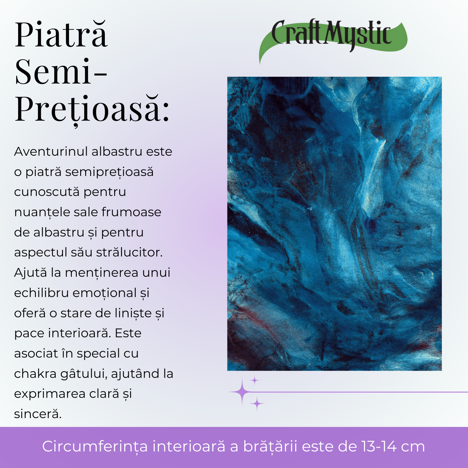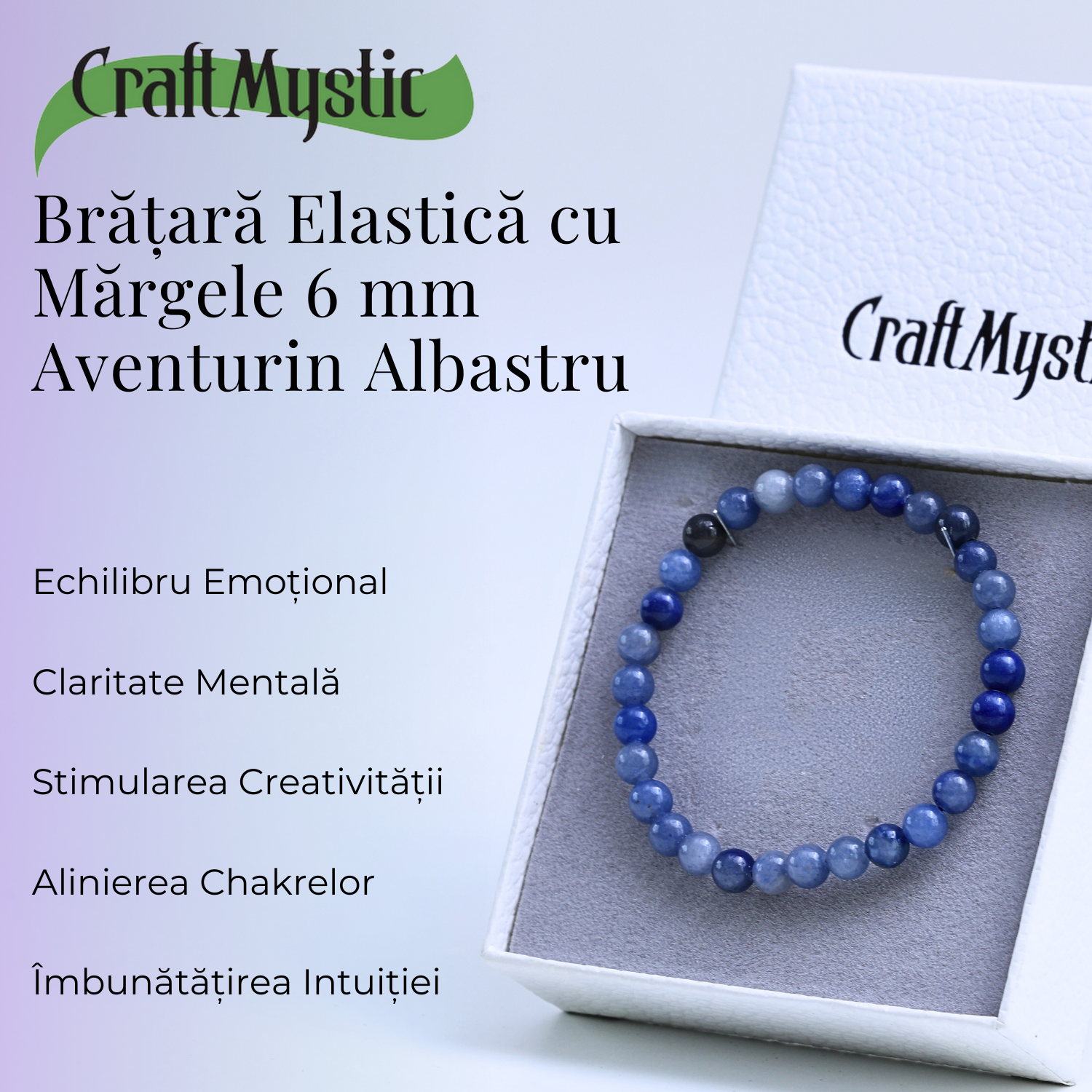 - Bucură-te de Beneficii: Poartă brățara zilnic pentru a beneficia de claritatea mentală și focusul oferite de Aventurinul Albastru.