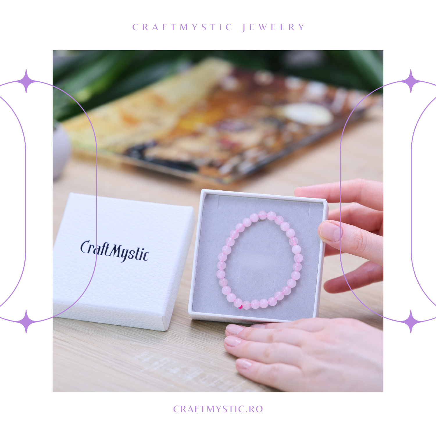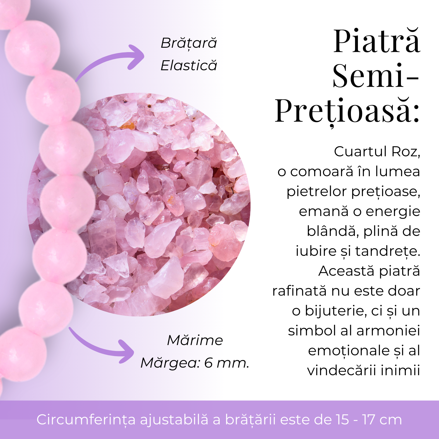 Descriere: Aceasta bratara elastica cu margele de 6mm din cuart roz semipretios este un accesoriu delicat si plin de semnificatie. Perfecta pentru a adauga o nota de dragoste si calm oricarei tinute, bratara este ideala pentru iubitorii de pietre semipretioase.