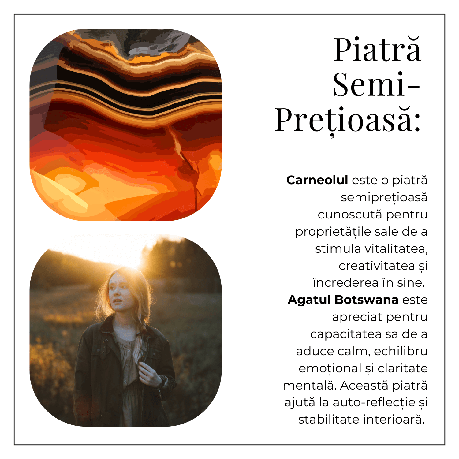 Carneolul este o piatra a energiei si vitalitatii, fiind cunoscut pentru stimularea curajului si creativitatii. Agatul Botswana, pe de alta parte, ofera calm si echilibru emotional. Aceasta combinatie puternica este recomandata pentru zodiile Berbec, Leu, Fecioara si Scorpion, ajutand la mentinerea unei stari de energie pozitiva si motivatie.