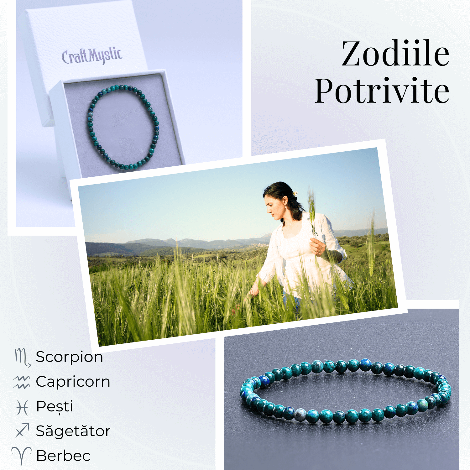 Brățara din Malachit cu Azurit este deosebit de benefică pentru zodiile Taur, Scorpion și Capricorn, dar poate aduce energie pozitivă și claritate oricărui purtător, indiferent de zodie.