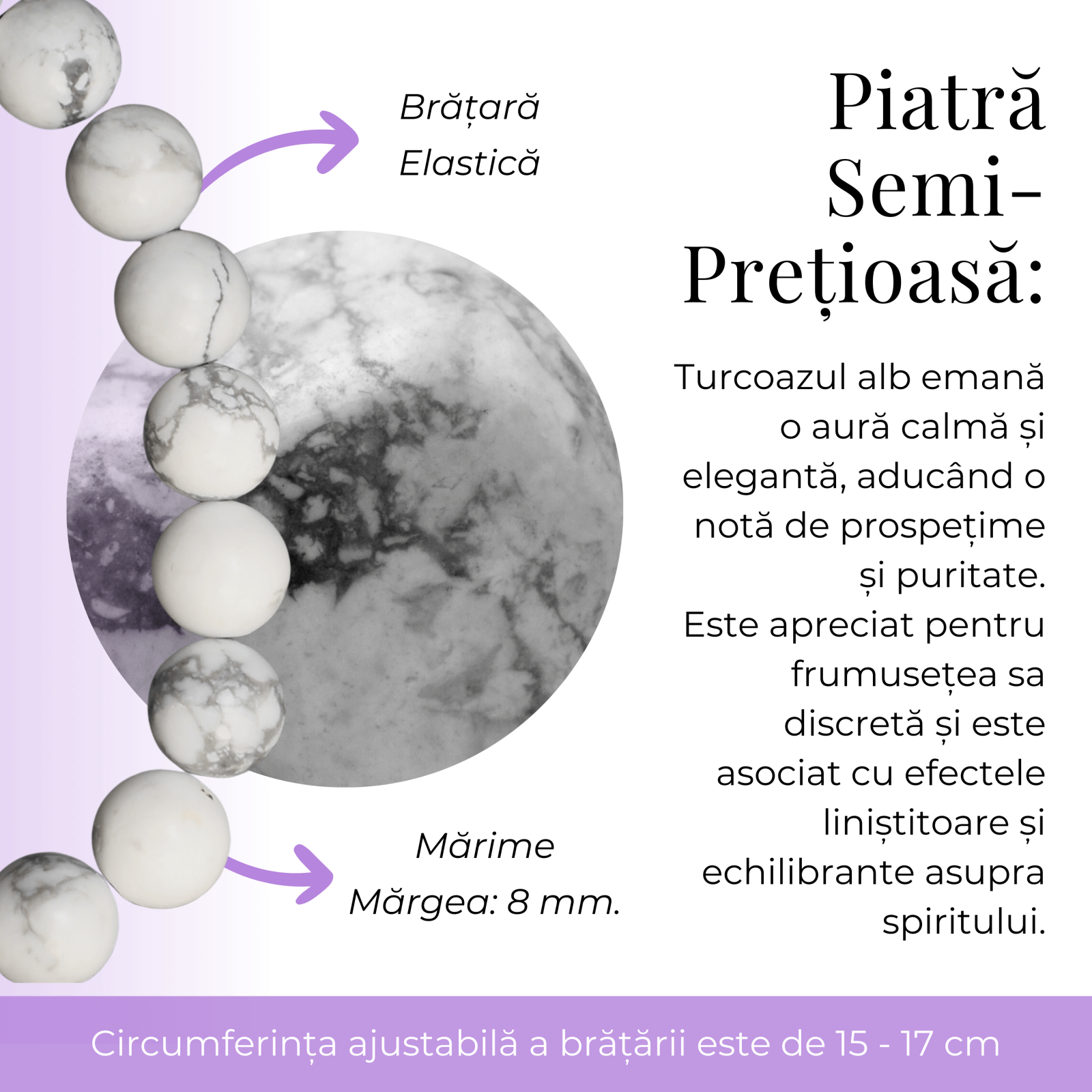 Descriere: Aceasta bratara elastica cu margele de 8mm din howlita naturala este un accesoriu delicat si plin de semnificatie. Perfecta pentru cei care cauta un accesoriu calmant si echilibrant, bratara imbina frumusetea naturala cu beneficiile spirituale ale howlitei.