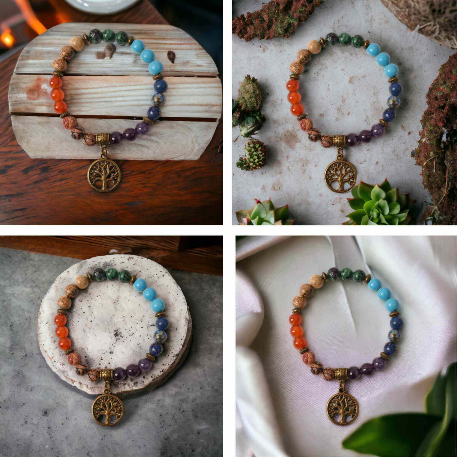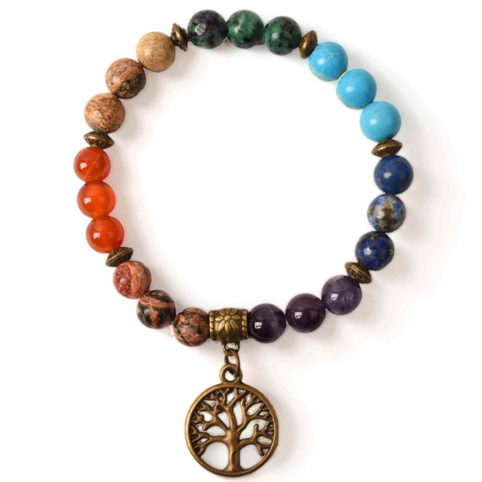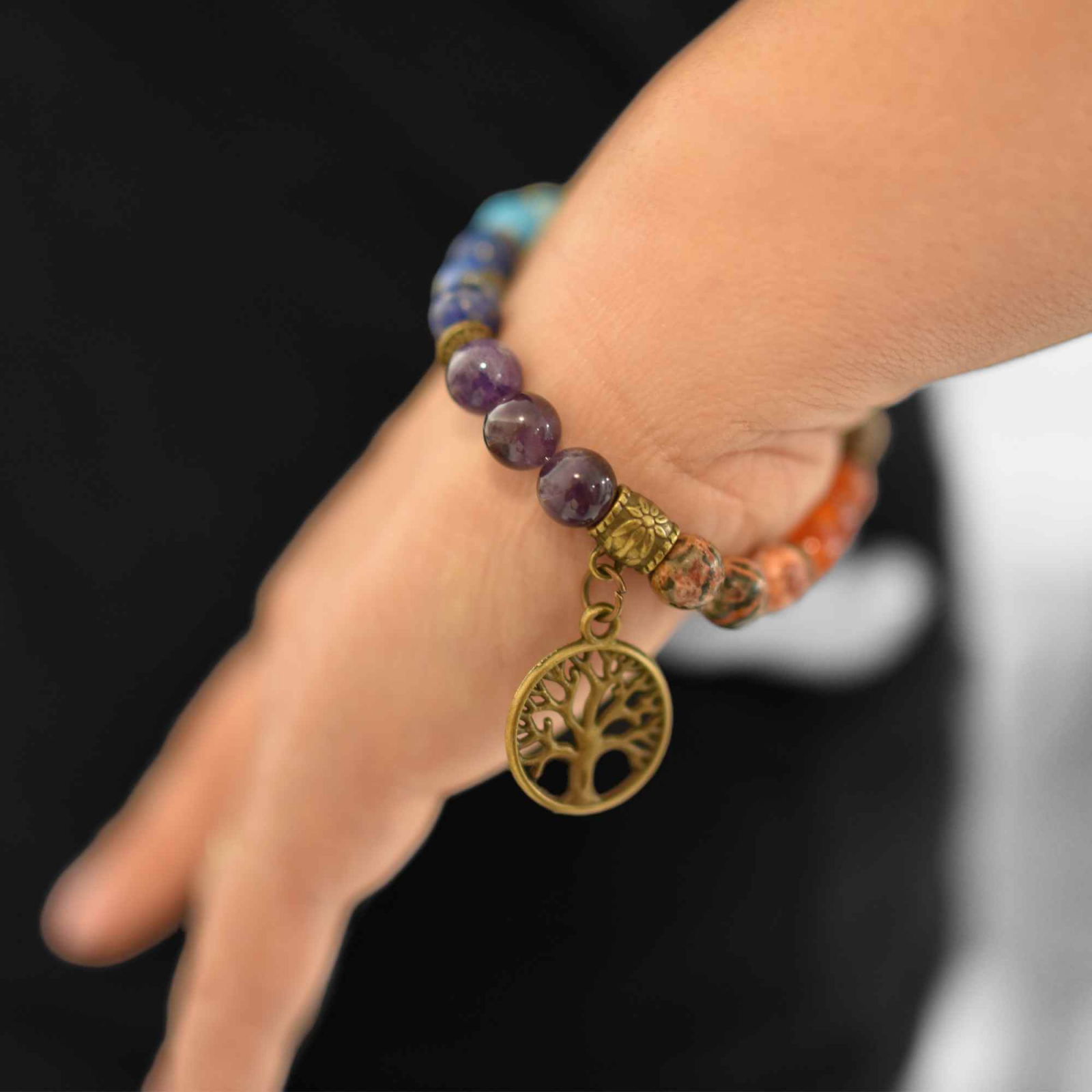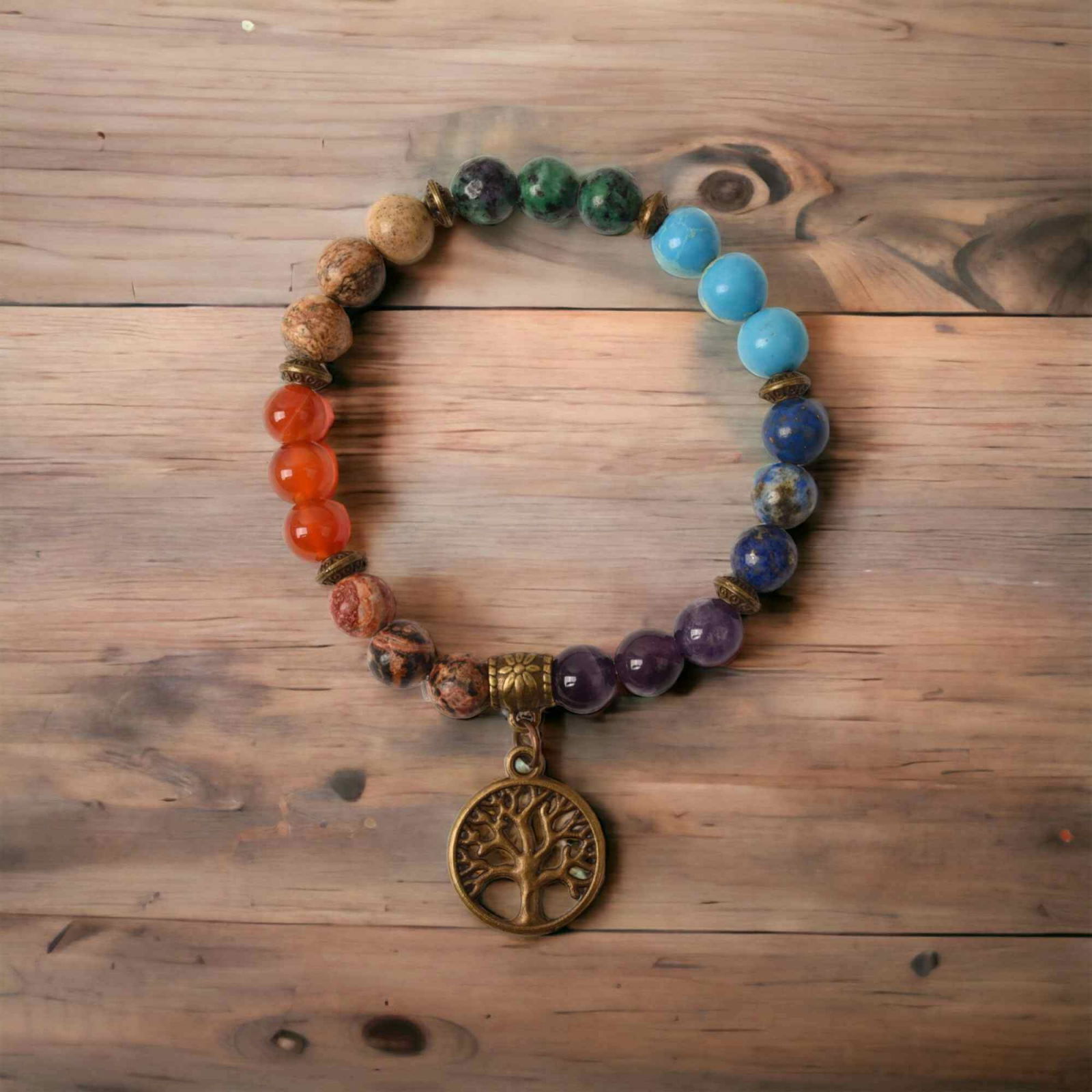 Bratara Elastica cu Pietre Naturale pentru Cele 7 Chakre si Pandantiv cu Arborele Vietii