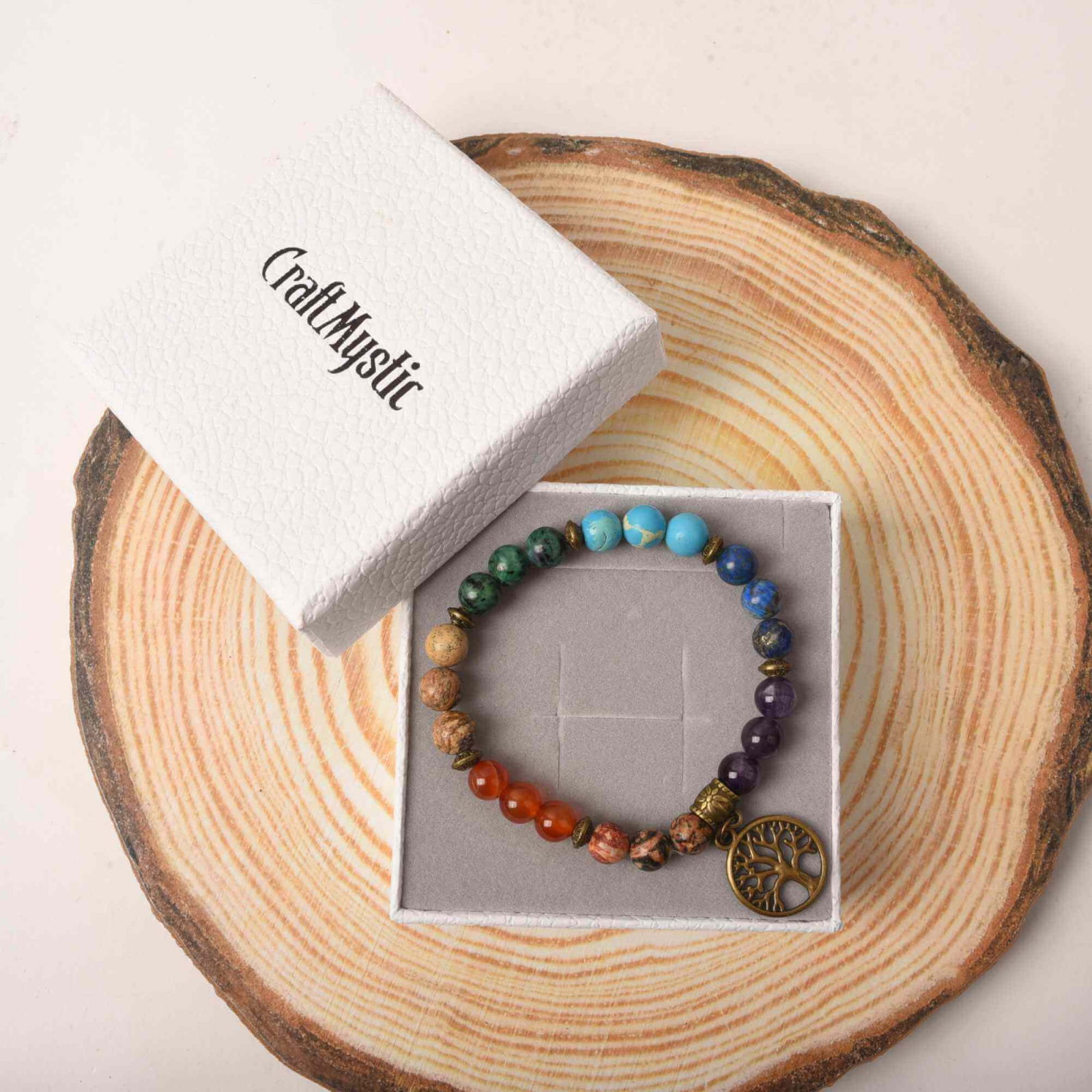 Aceasta bratara caracteristica este incarcata cu pietre naturale ce corespund celor sapte chakre principale ale corpului uman. Ajuta la echilibrarea energiei vitale, promovand sanatatea fizica, emotionala si spirituala. Chiar daca nu practici yoga sau meditatie, aceste pietre te pot ajuta sa te simti mai centrat si calm in viata de zi cu zi.