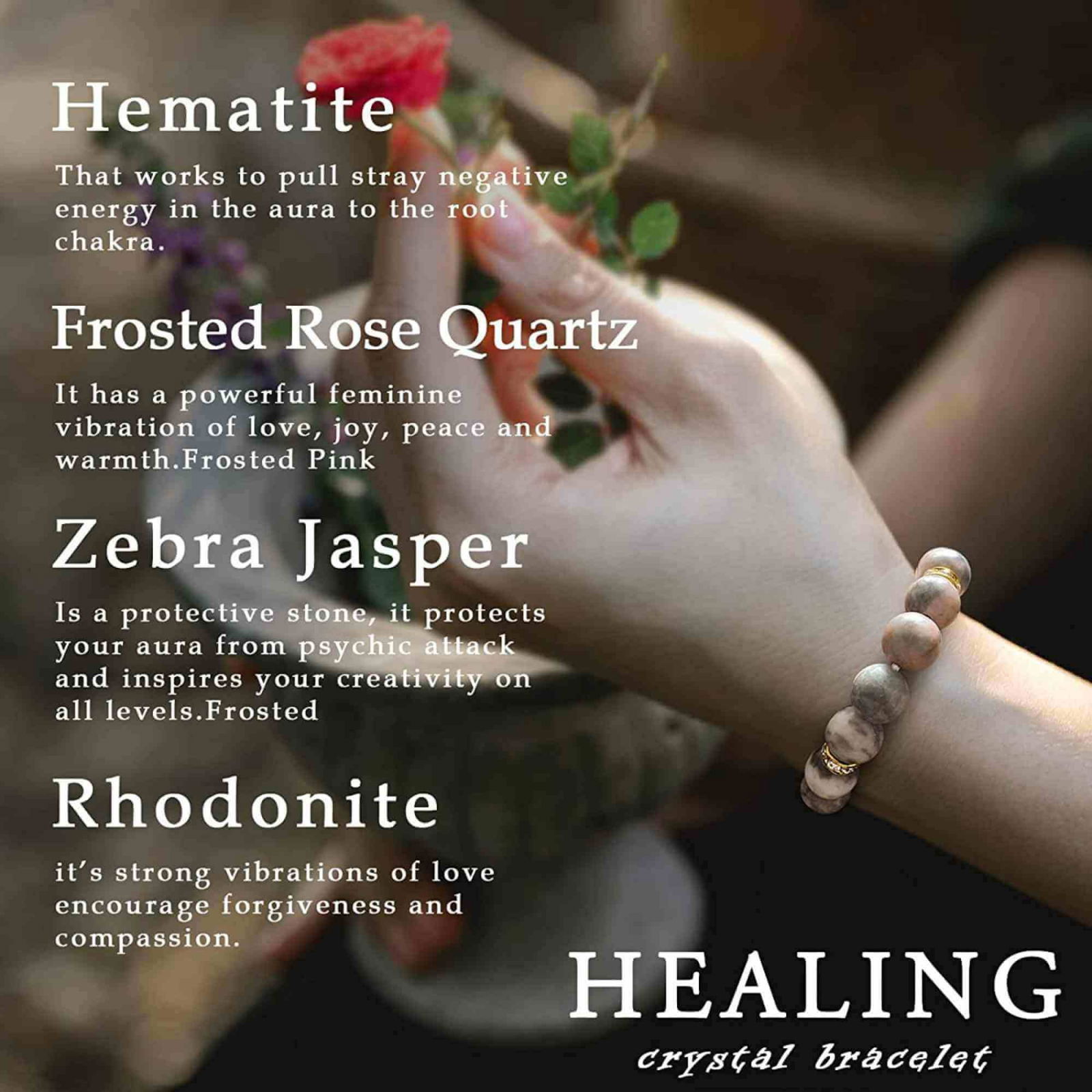 • Prin urmare, este important sa aveti chakrele perfect echilibrate si deschise. Purtand aceasta bratara la incheietura mainii in fiecare zi, puterea pietrelor este amplificata. Purtarea bijuteriilor cu pietre vindecatoare te ajuta sa fii pozitiv, sa atingi echilibrul interior intre minte si corp;