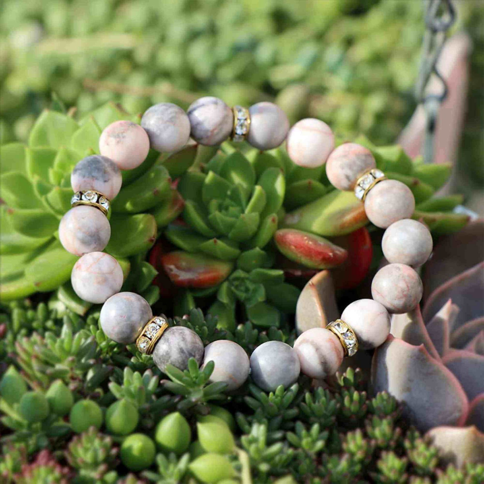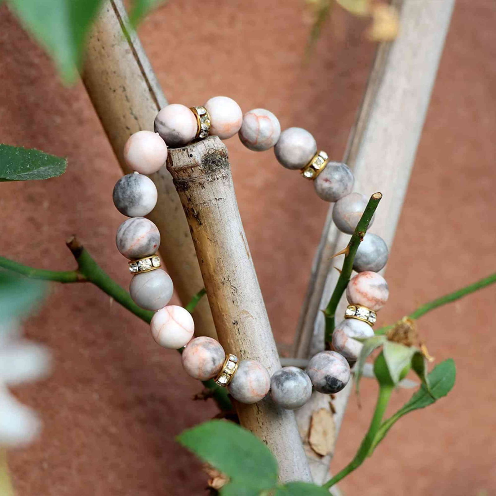 • Bratara elastica este lucrata manual cu margele semipretioase zebra stone roz de 10 mm si 5 margele aurii cu strasuri. Se spune ca zebra stone este folosita ca talisman pentru ca oamenii sa se protejeze de rele. Are functiile de a ameliora oboseala mentala, de a spori increderea in sine si de a imbunatati concentrarea;