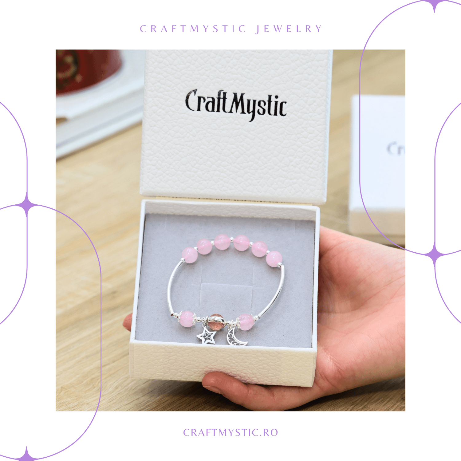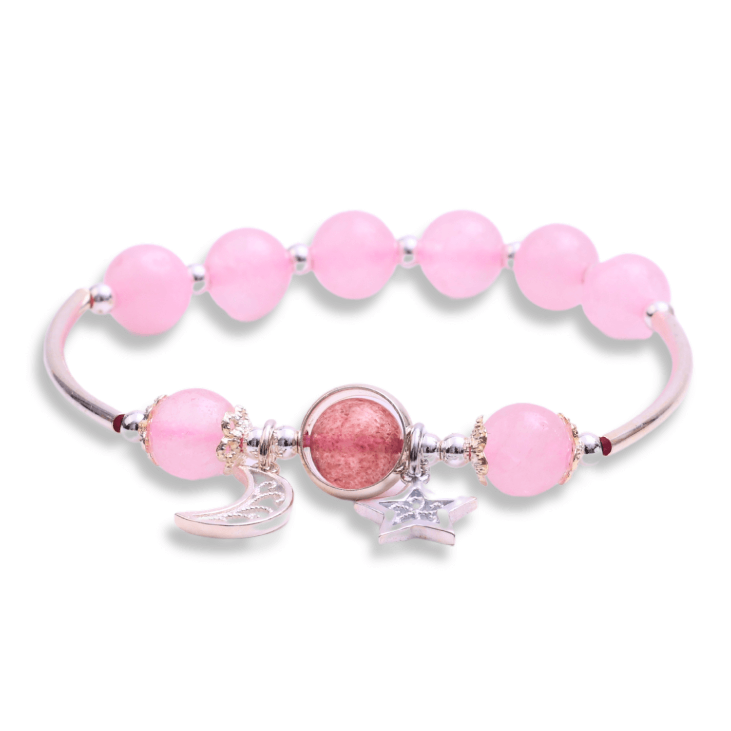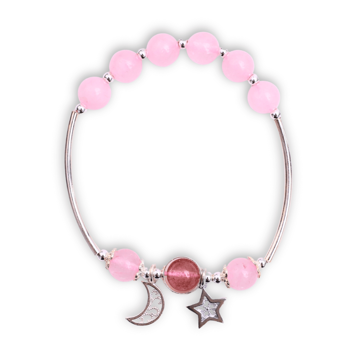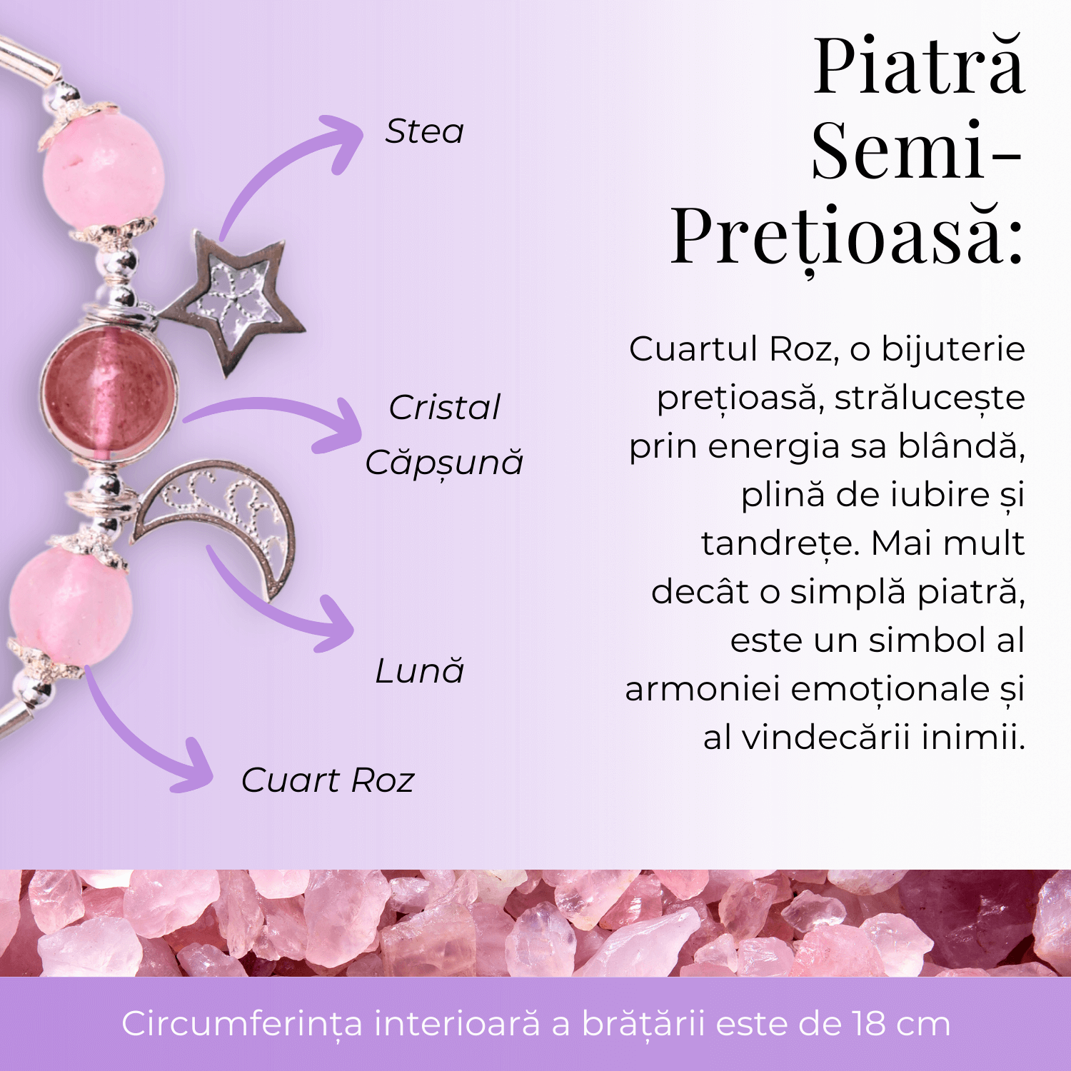Aceasta bratara captivanta prezinta margele de cuart roz si este impodobita cu un pandantiv delicat reprezentand o stea si o luna. O alegere perfecta pentru cei care doresc sa combine eleganta cu semnificatia simbolica a cerului nocturn.