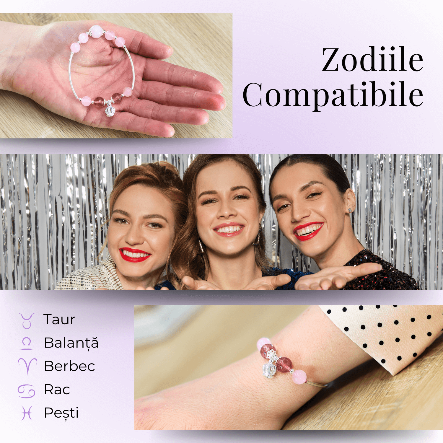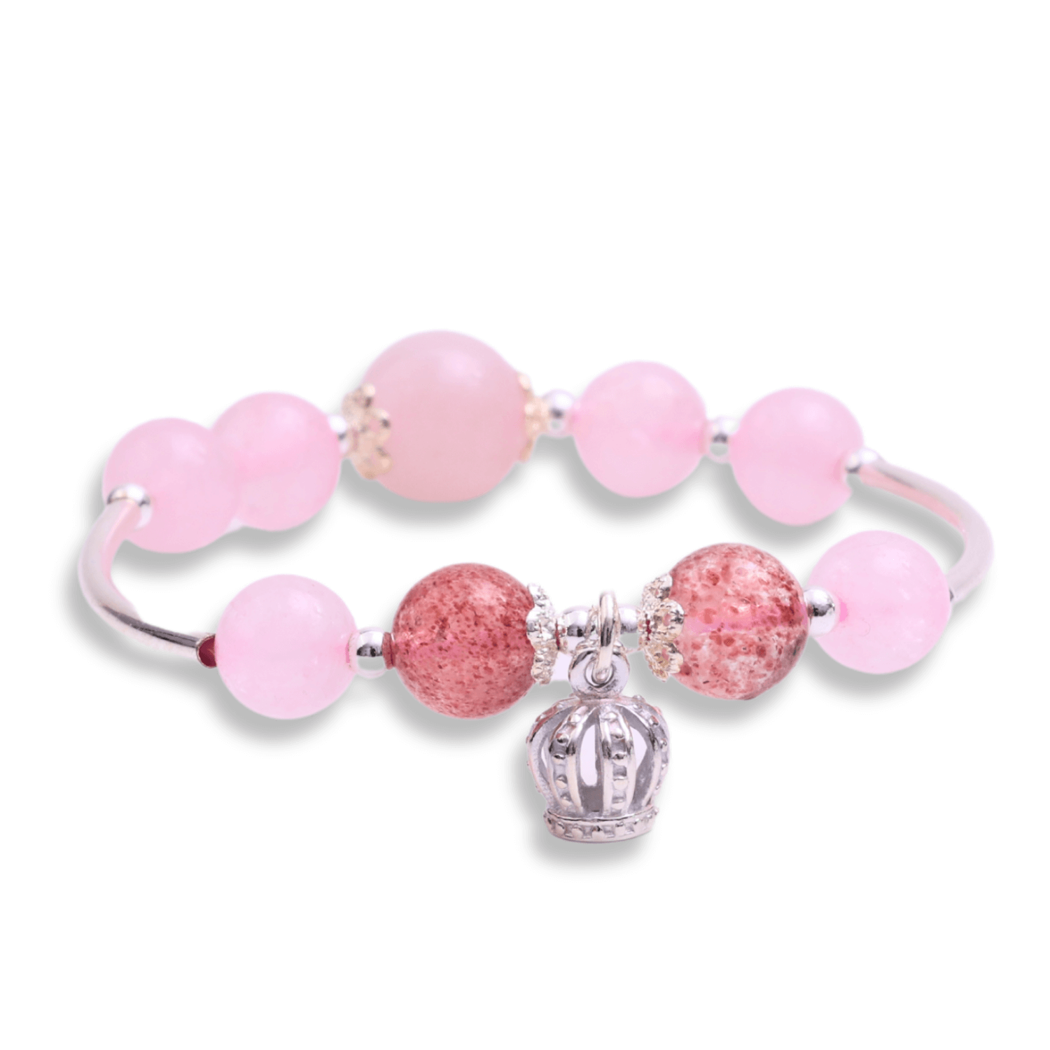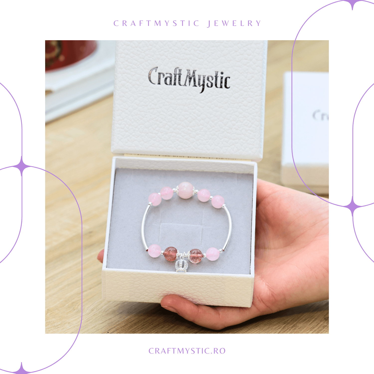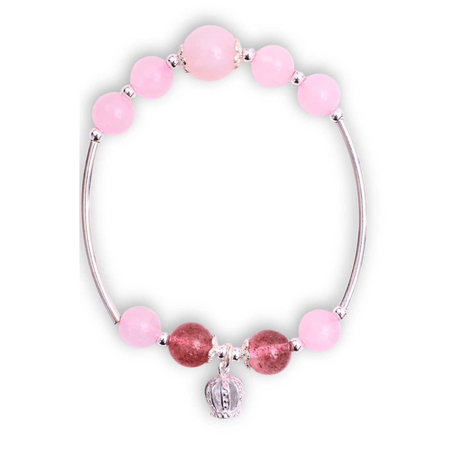 Aceasta bratara eleganta combina frumusetea margelelor de cuart roz cu un pandantiv sofisticat in forma de coroana. Este o alegere perfecta pentru a adauga un strop de regalitate si echilibru emotional la orice tinuta.