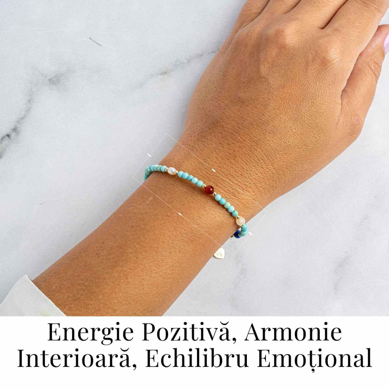 Combinatia de turcoaz, agat rosu, lapis lazuli, jad alb, topaz galben si perla naturala aduce protectie, curaj, claritate si pace sufleteasca.