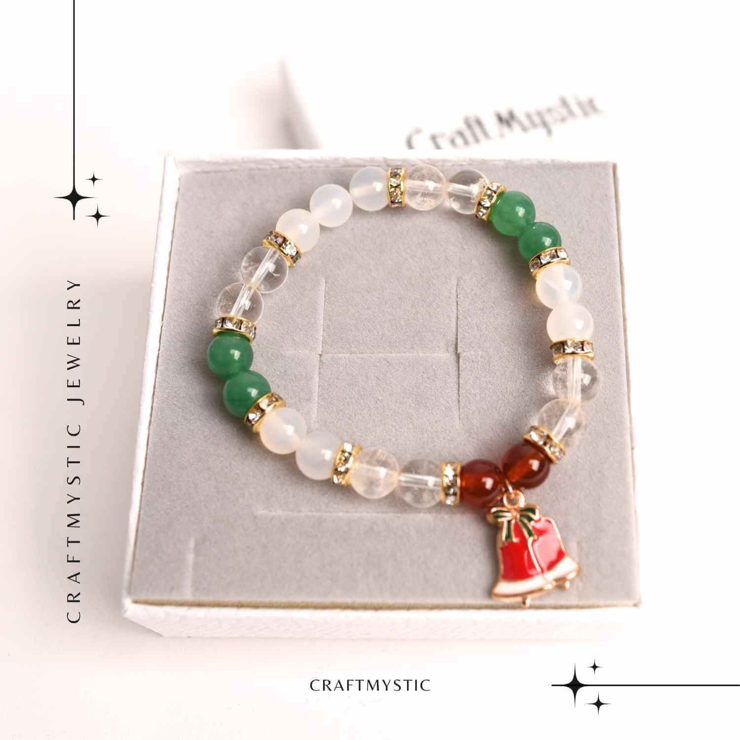 Brățară din Agat roșu, alb și Aventurin verde cu mărgele de 6 mm și pandantiv mix: O bijuterie elegantă, lucrată manual, care îmbină frumusețea naturală cu semnificații energetice profunde. Include un pandantiv festiv aleatoriu (Moș Crăciun, clopoțel, brăduț, semilună etc.), fiind un cadou perfect pentru sărbători sau ocazii speciale.