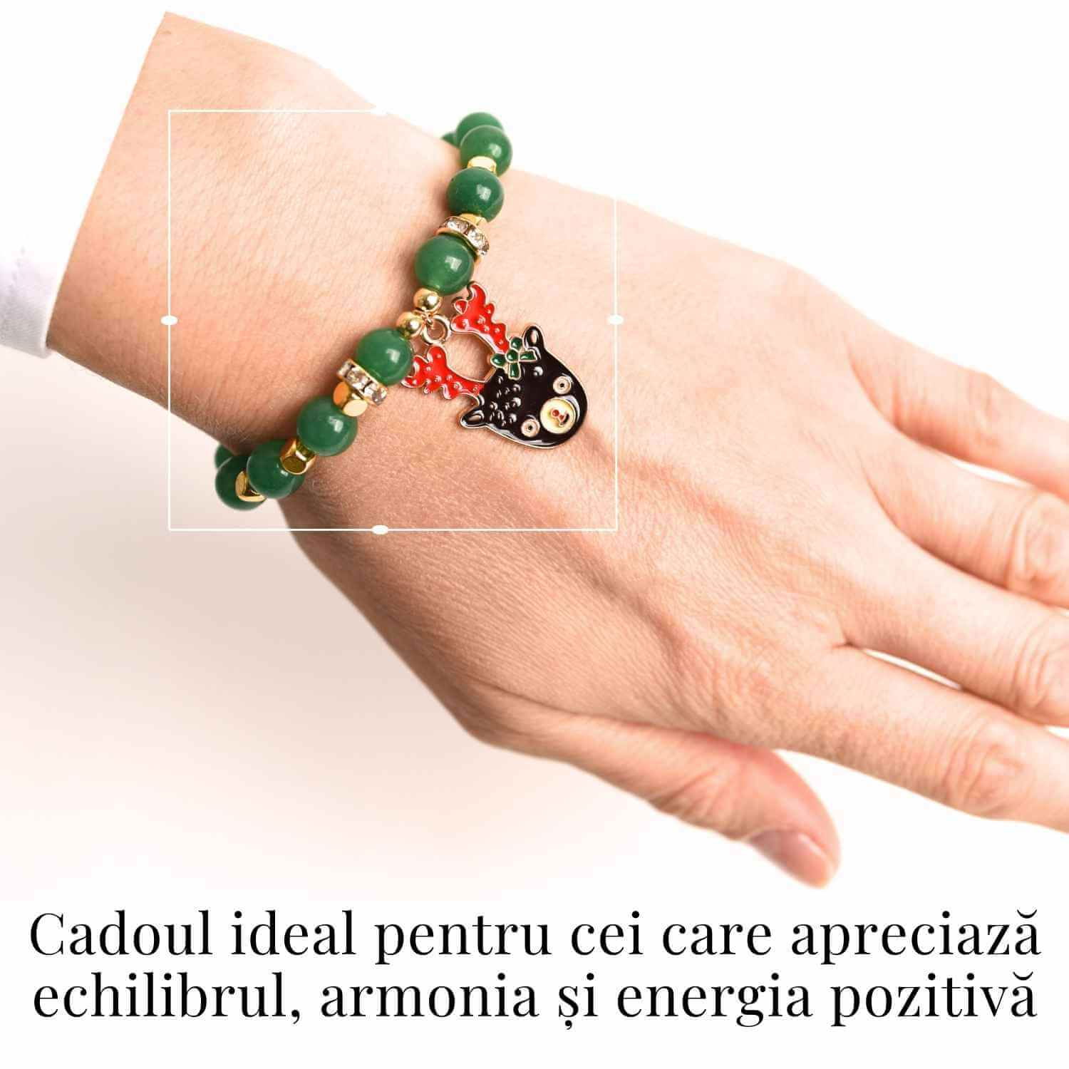 Brățară din Aventurin verde cu mărgele de 6 mm și pandantiv mixt: Un accesoriu sofisticat, perfect pentru sărbători sau ocazii speciale. Fiecare brățară este unică, având un pandantiv festiv aleatoriu (Moș Crăciun, ren, clopoțel, brăduț, semilună etc.), oferind un simbol al bucuriei și energiei pozitive.