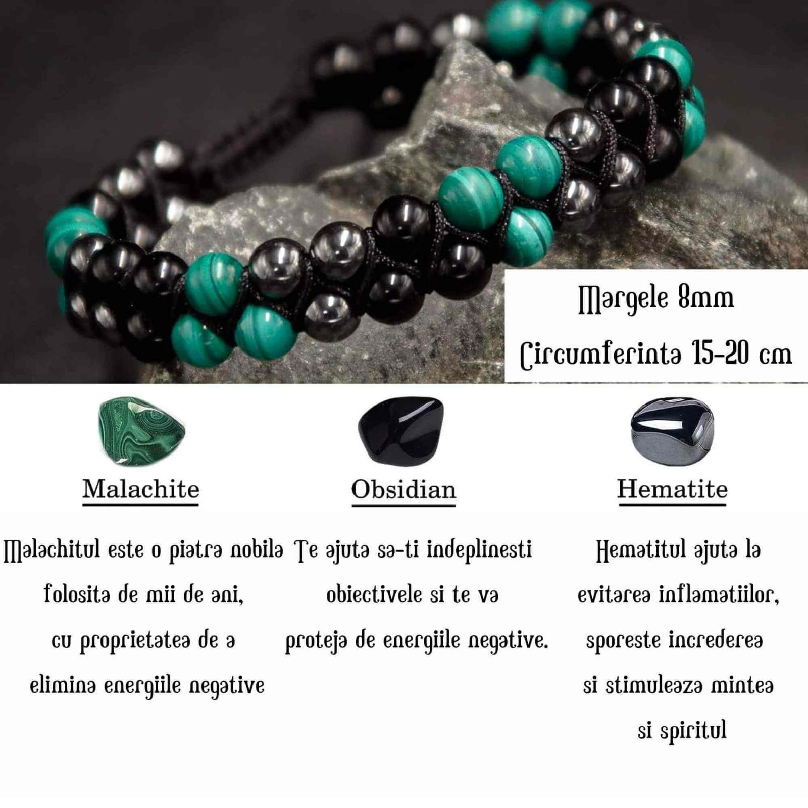 • Pietre de Vindecare Autentice: Aceasta bratara unica contine pietre semipretioase de malachit, obsidian negru si hematit. Fiecare dintre aceste pietre este cunoscuta pentru energia sa pozitiva si capacitatile de vindecare. Malachitul ajuta la curatarea si reincarcarea chakrelor, creste increderea si imbunatateste intuitia, in timp ce hematitul si obsidianul contribuie la echilibrul energetic general;