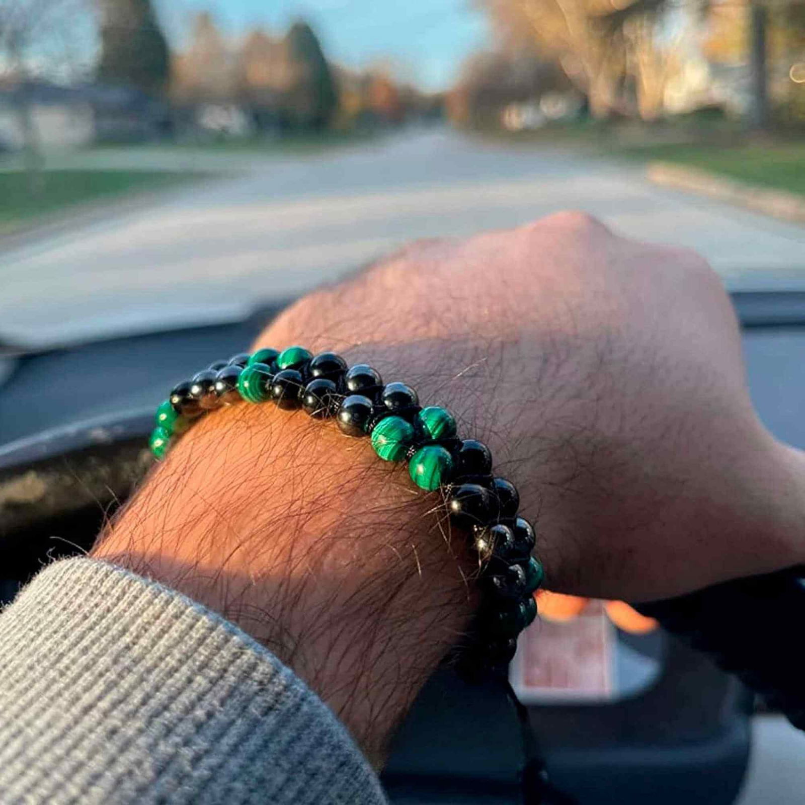 Bratara tripla protectie cu Cristale 8mm de Malachit, Obsidian Negru si Pietre Hematit - Bijuterie Autentica de Vindecare pentru Barbati si Femei
