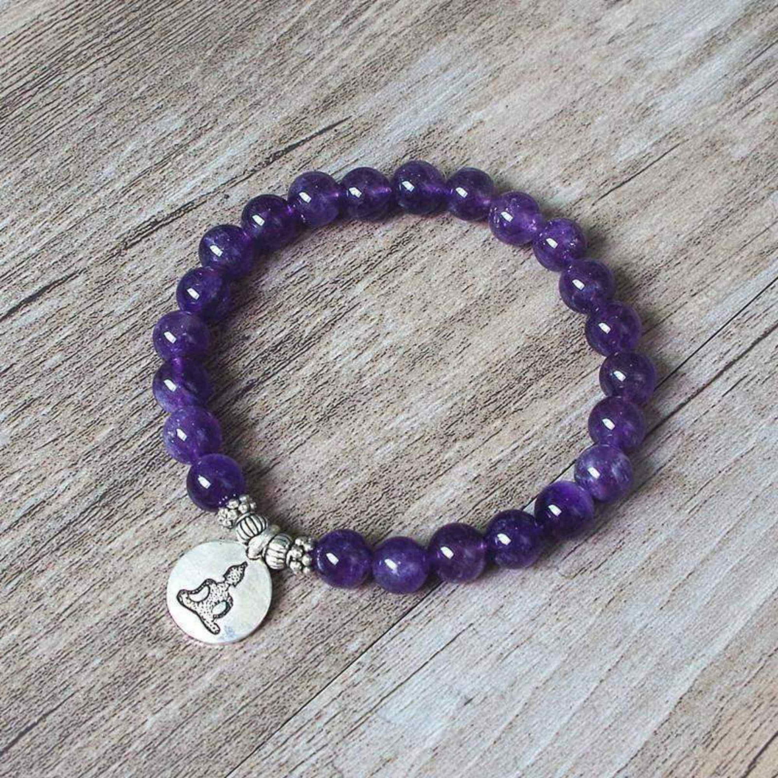 Bratara zen cu cristale semipretioase din ametist 8 mm si pandantiv argintiu gravat cu Buddha Feng shui pentru meditatie, liniste, echilibru