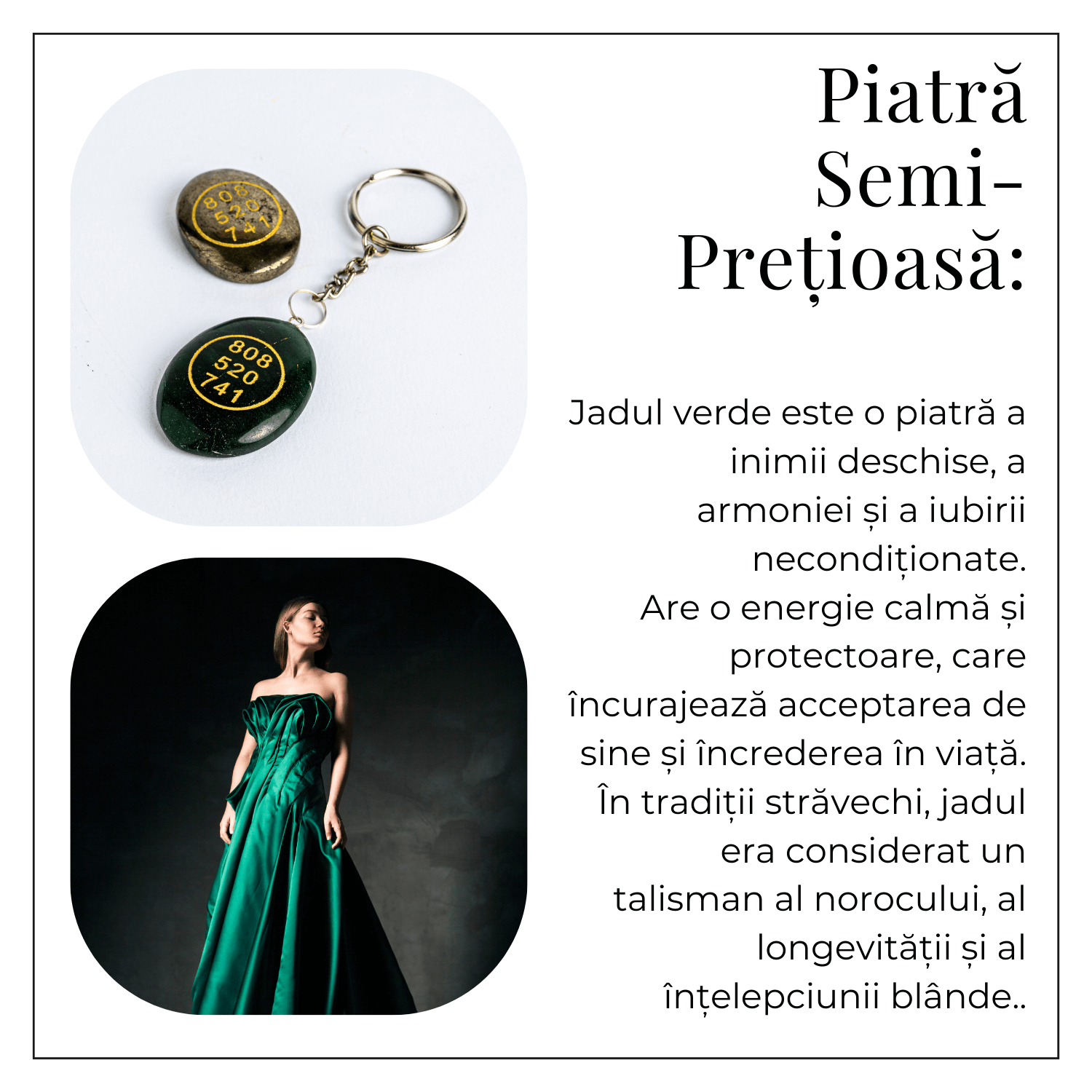 Simți o stare de pace, calm interior și protecție subtilă. Jadul verde aduce echilibru și energie pozitivă, iar simbolul Zibu amplifică vibrațiile de iubire universală, luminându-ți drumul și intențiile.