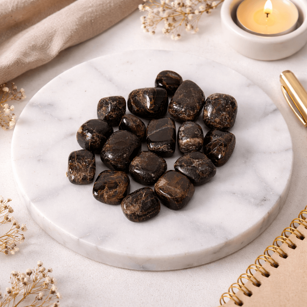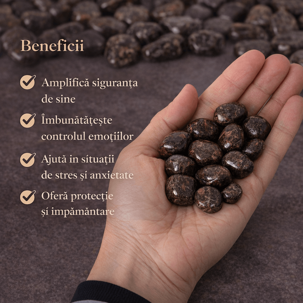Pietrele rulate de bronzit transmit o stare de calm activ și siguranță interioară. Sunt asociate cu energia pământului și cu sentimentul de a fi bine ancorat în propriile decizii, chiar și în perioade de presiune sau schimbare.