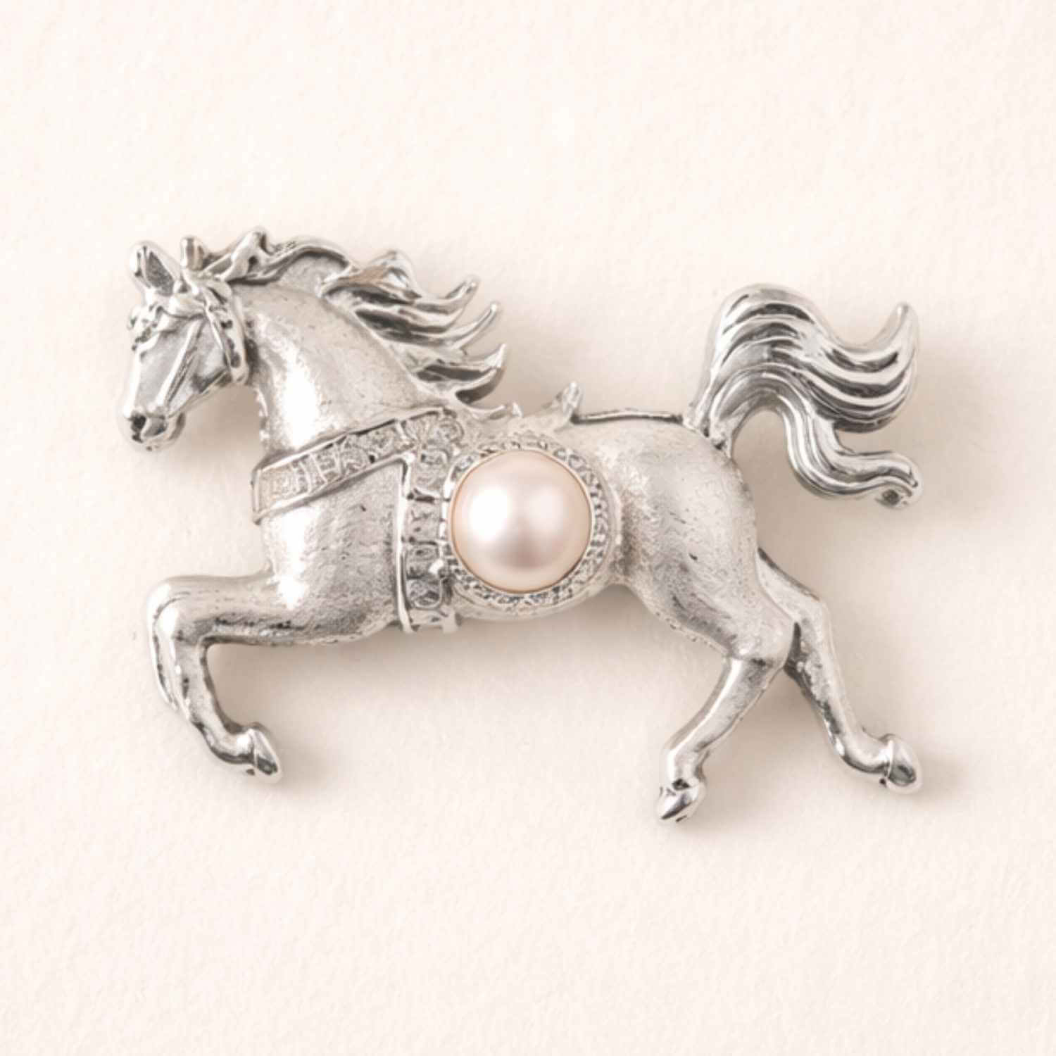 Aceasta brosa in forma de cal simbolizeaza energia feminina care imbina eleganta cu determinarea. Perla naturala adauga o nota de rafinament si echilibru emotional.