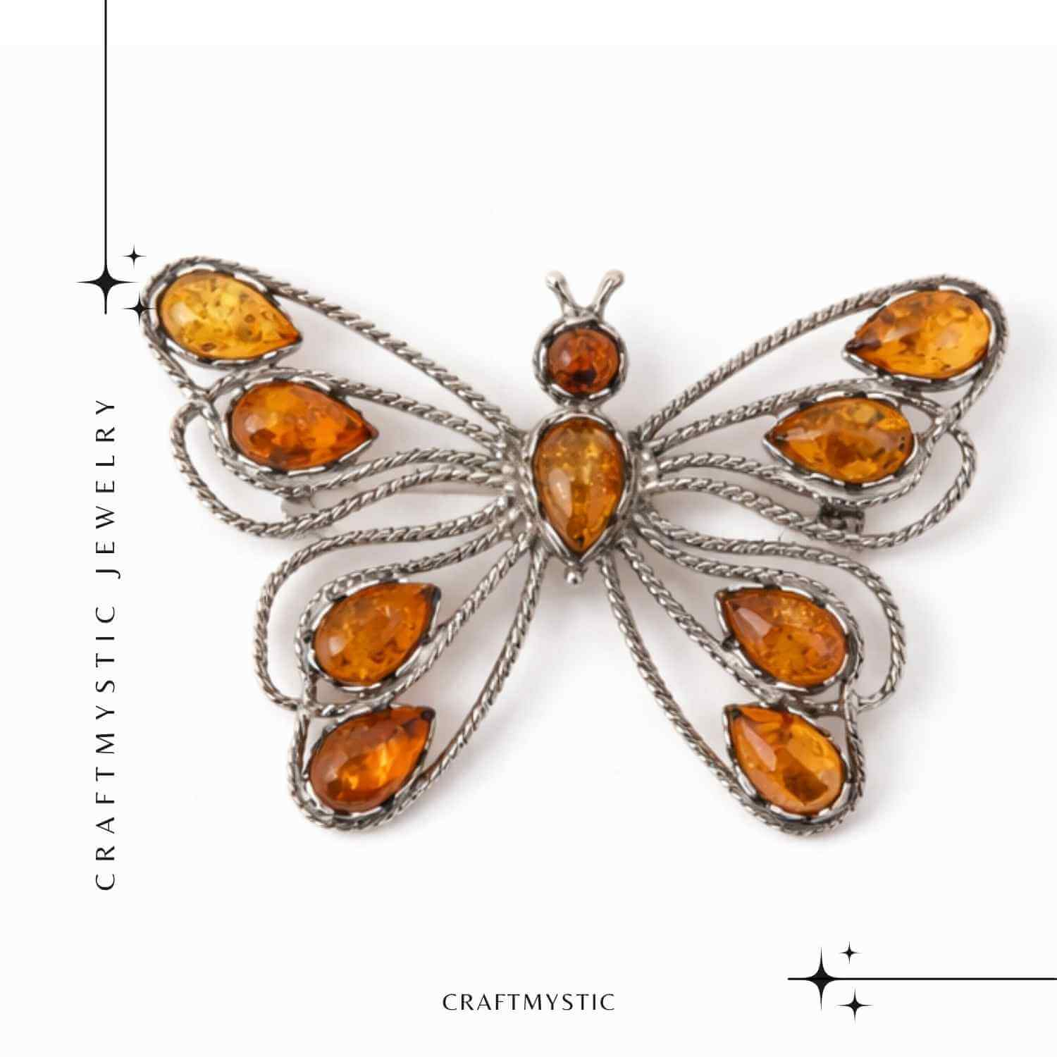 Chihlimbarul, cu nuanţele sale calde, este asociat simbolic cu lumina, căldura şi echilibrul emoțional. Broșa în formă de fluture sugerează transformare subtilă, graţie şi libertate de exprimare — un obiect care aminteşte să porţi cu tine atenţie, valoare şi o discreta bucurie.