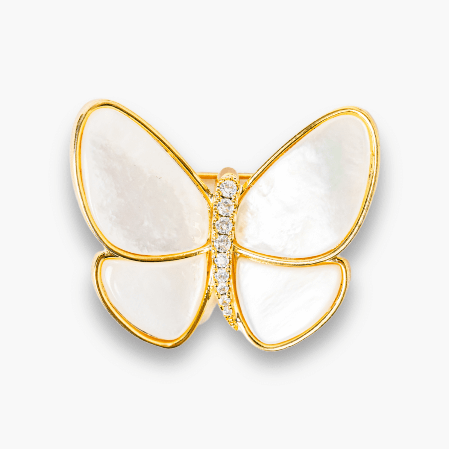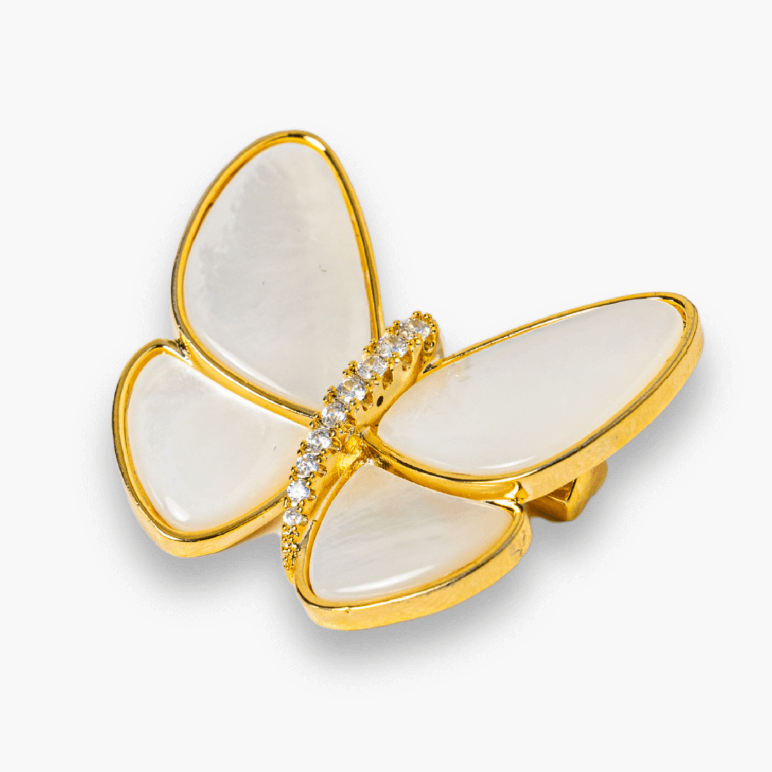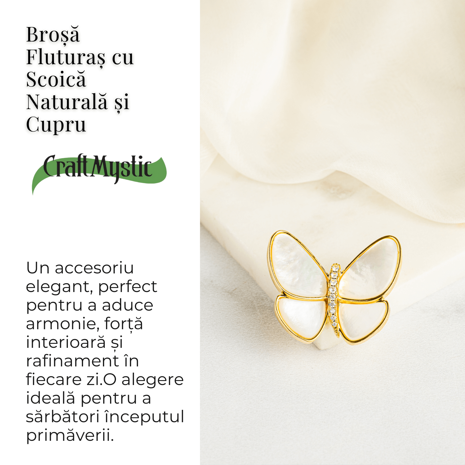 Descriere produs: Descopera rafinamentul si simbolistica profunda a acestei brose elegante, inspirata de frumusetea naturii. Modelul delicat de fluturas este realizat din scoica naturala si montat pe o structura de cupru placata auriu, oferind un plus de stralucire si sofisticare oricarei tinute.