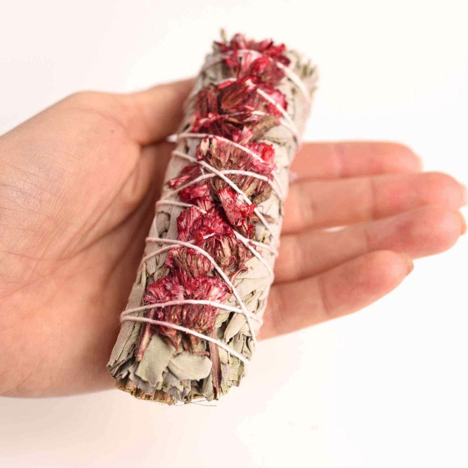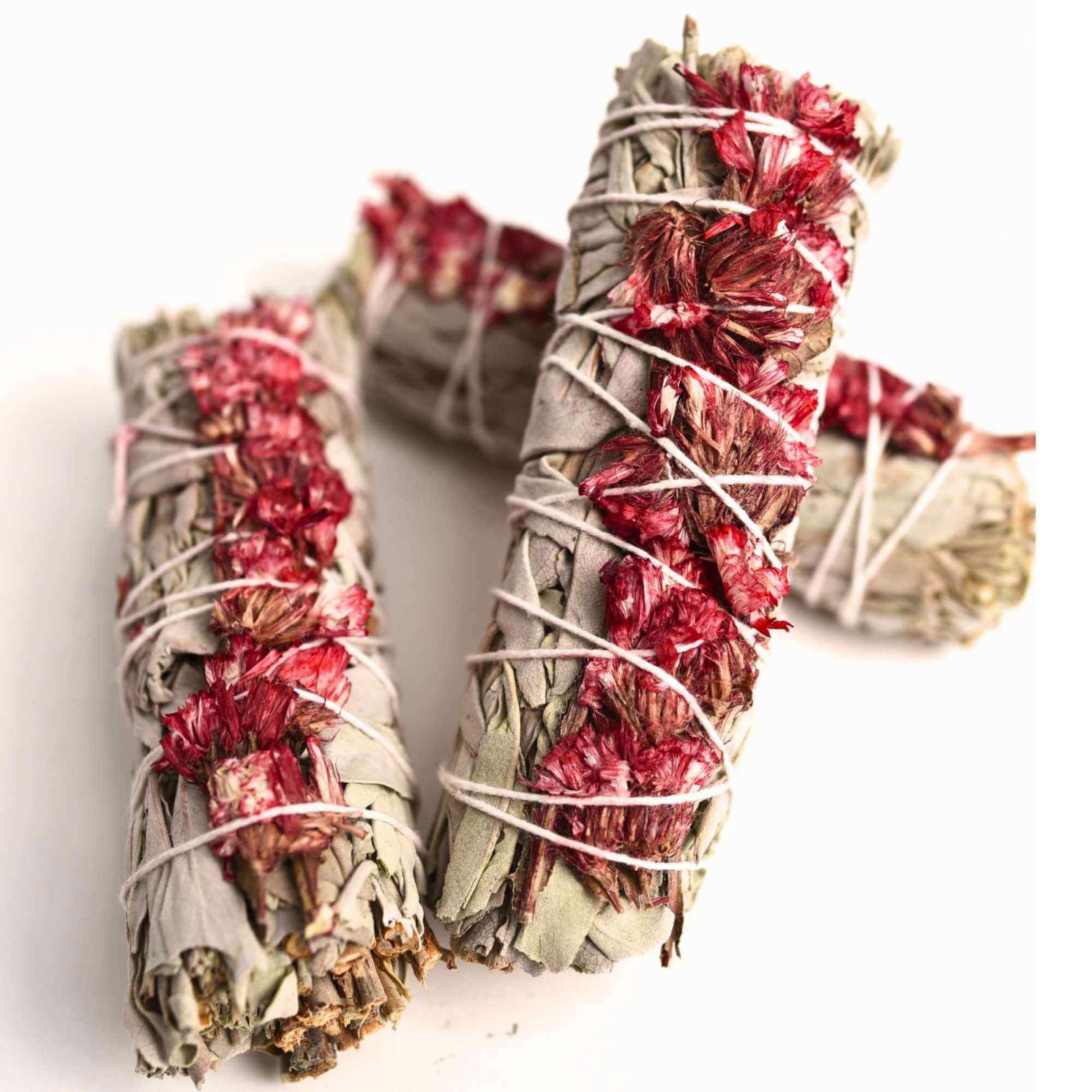 Materiale: Salvie albă și flori roșii de garofițe 100% naturale, lucrate manual. Fiecare buchet prezintă variații unice de textură și culoare.