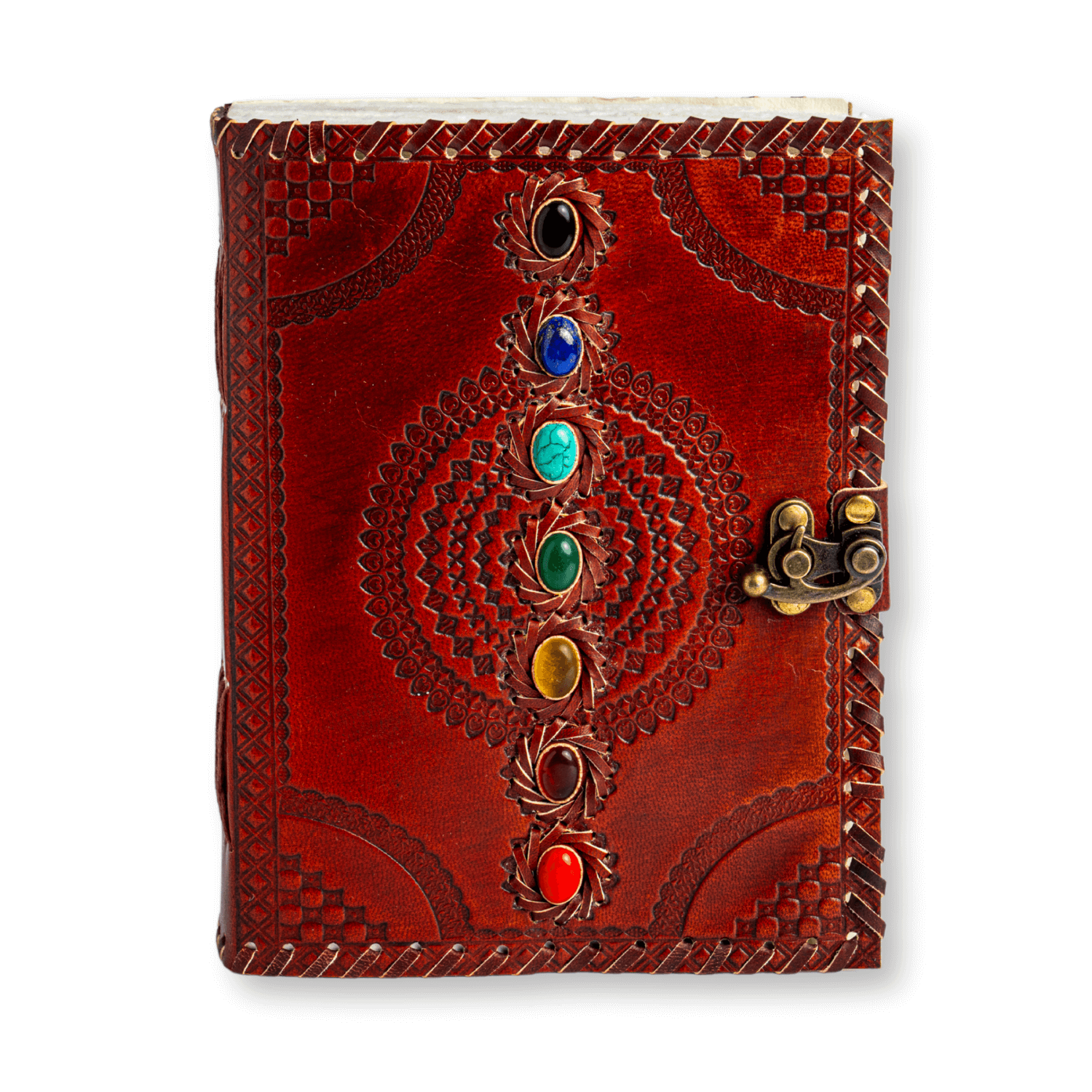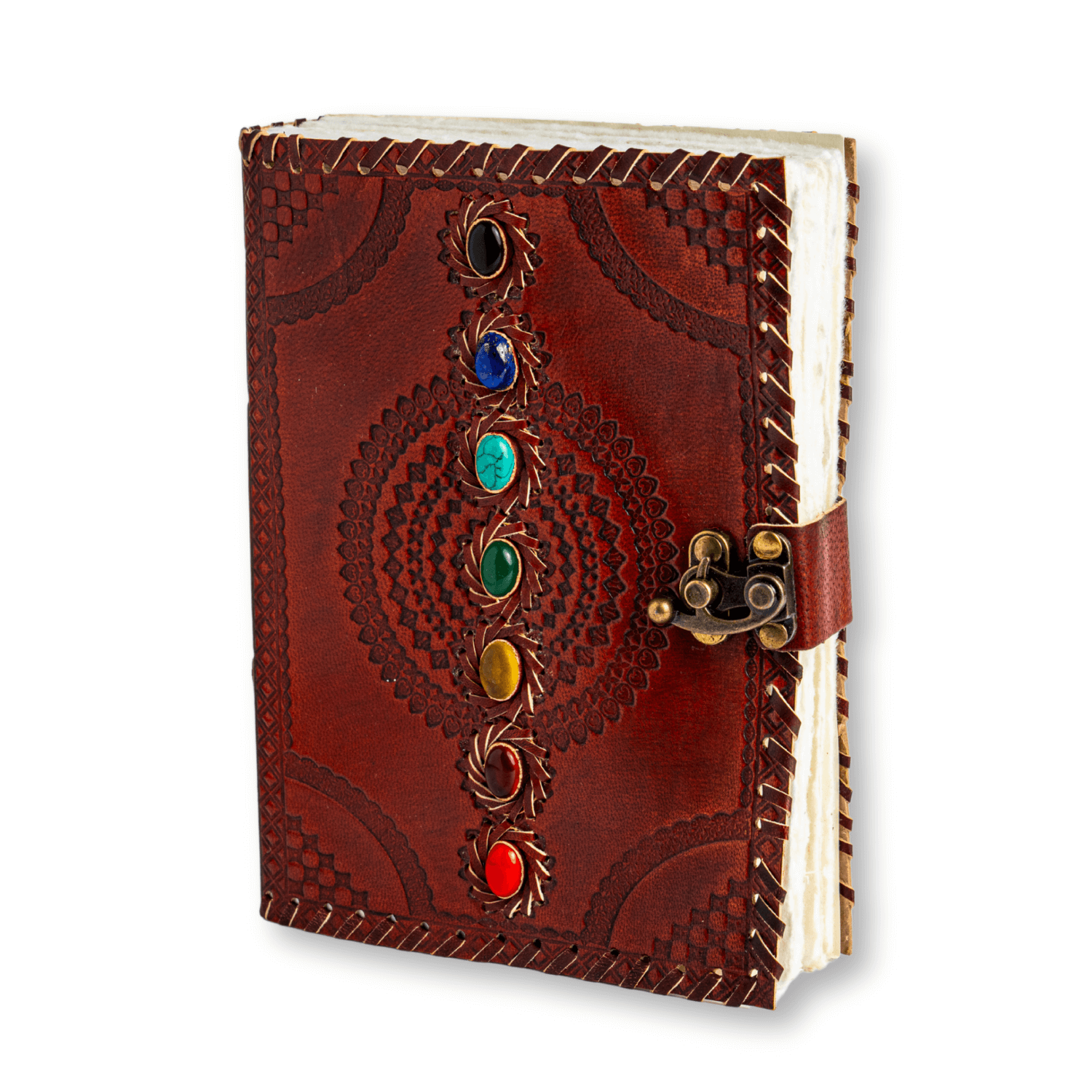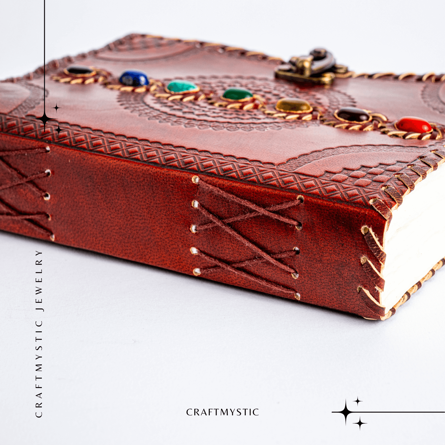 Un jurnal cu suflet – creat manual din piele naturala de culoare maro-roscat, decorat cu simboluri gravate si 7 pietre semipretioase dedicate chakrelor. Acest obiect deosebit este ideal pentru femeia spirituala, visatoare, creativa sau pasionata de dezvoltare personala, care isi doreste un spatiu personal pentru introspectie si exprimare libera.