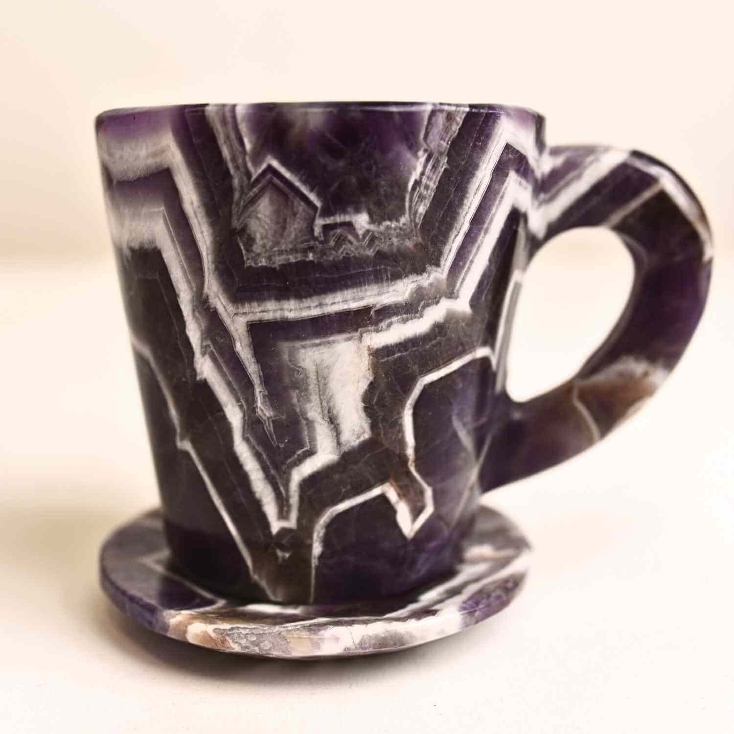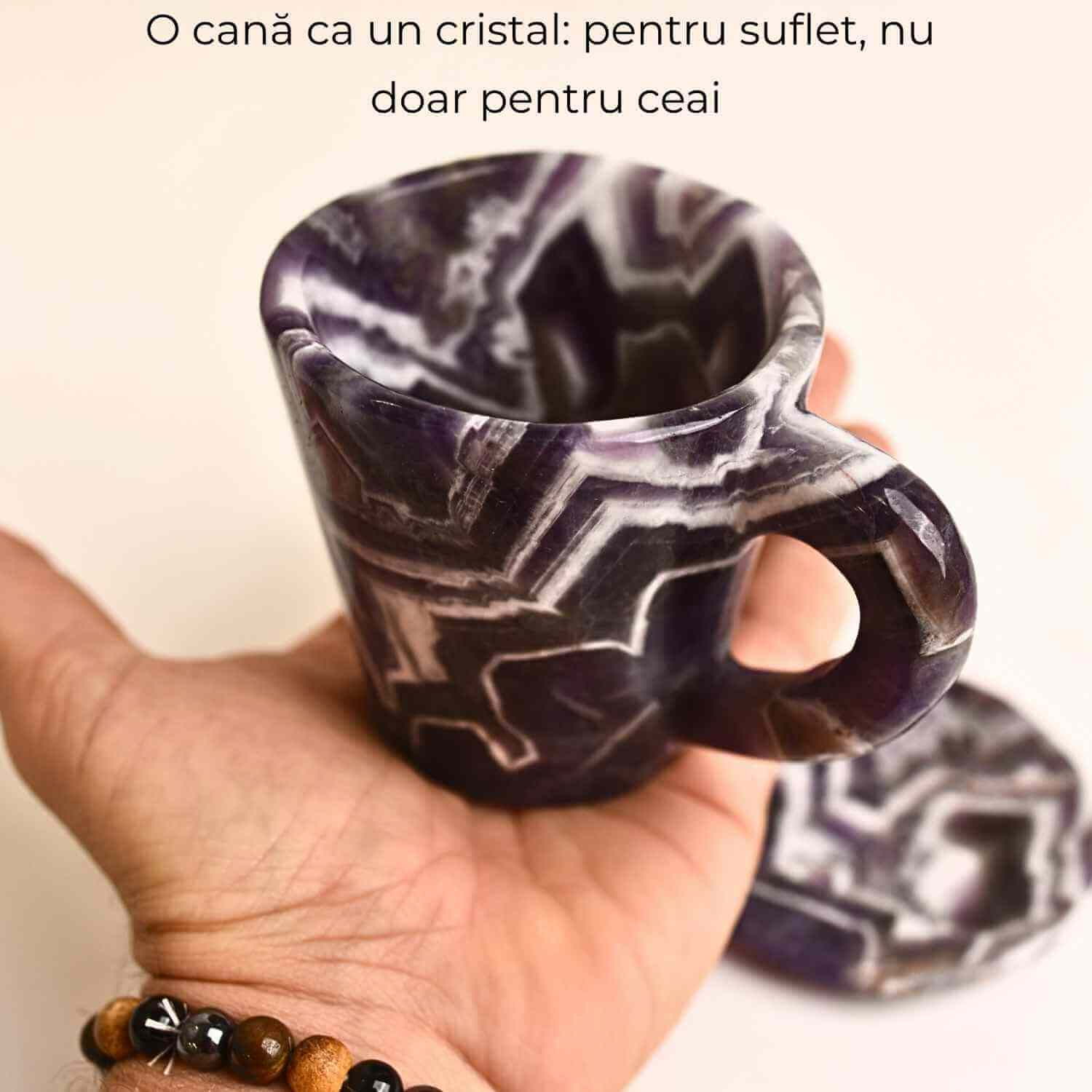 Această cană sculptată manual din Ametist Chevron nu este doar un obiect decorativ spectaculos – este un instrument al liniștii, al clarității interioare și al rafinamentului spiritual. Fiecare piesă este unică, realizată din cristal natural prețios, cu vene albe dramatice și tonuri regale de violet, ideale pentru cei care apreciază energia autentică a pietrelor naturale.