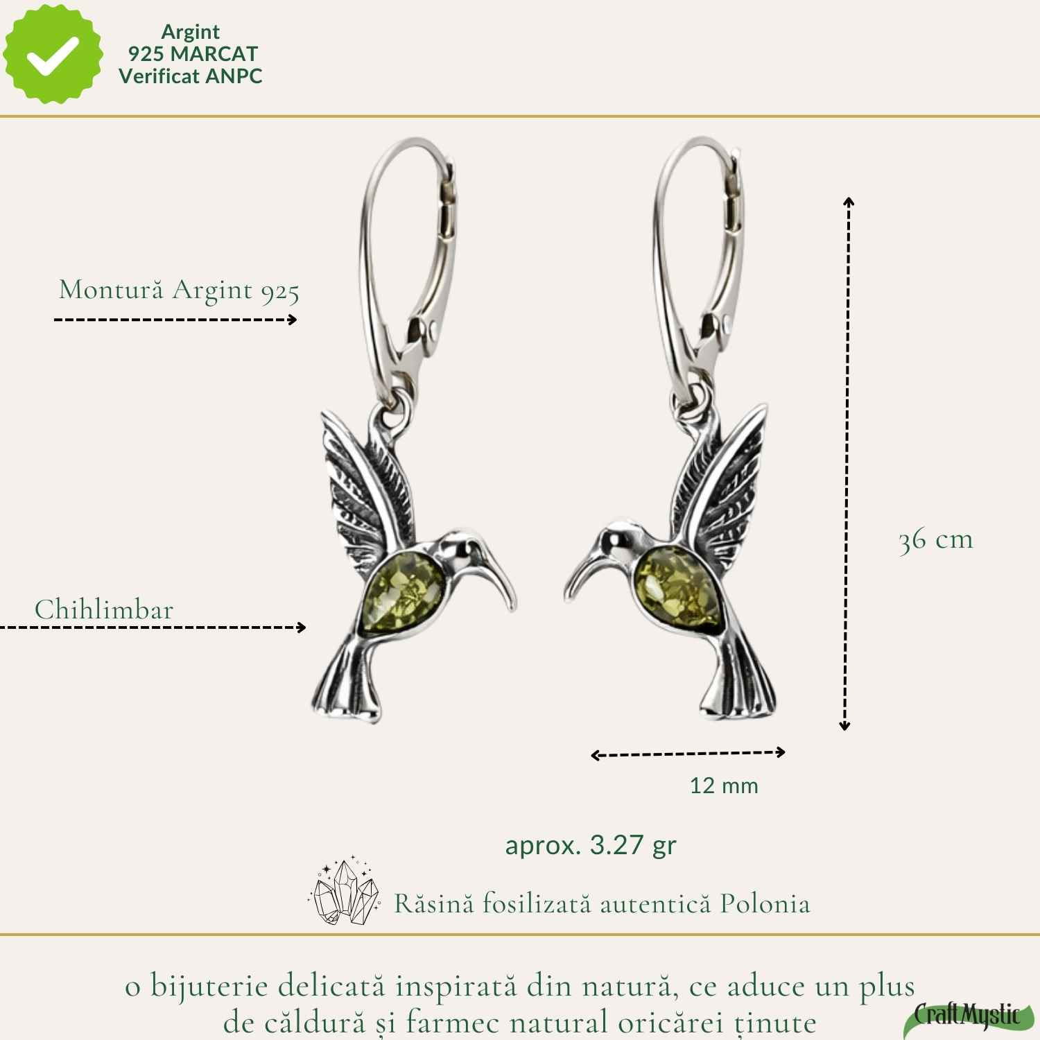 Colibriul este pasărea bucuriei și a momentelor trăite cu inima deschisă. Acești cercei din argint 925 cu chihlimbar verde aduc o notă delicată de lumină și libertate în fiecare zi. O bijuterie fină care îți amintește să te bucuri de lucrurile mici.
