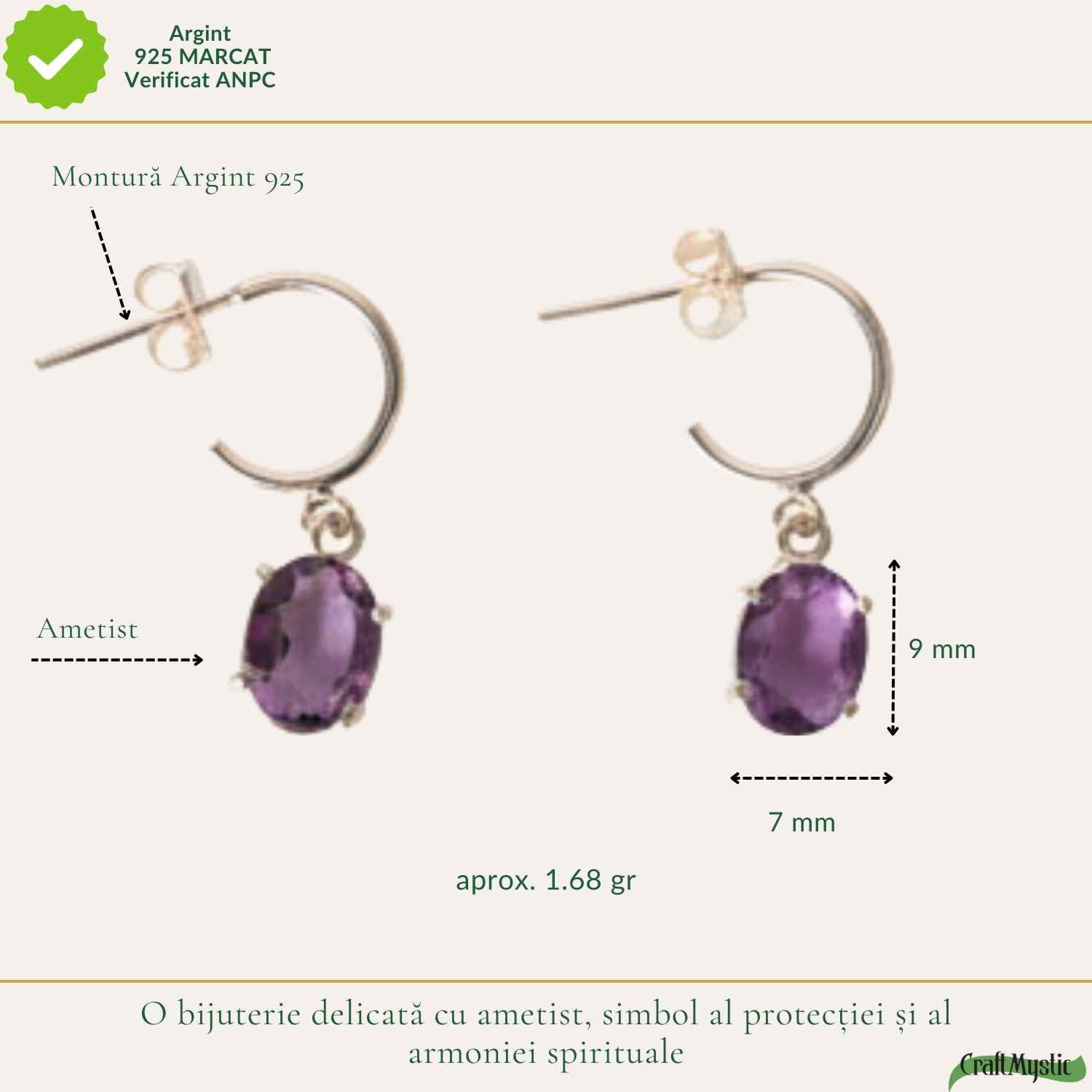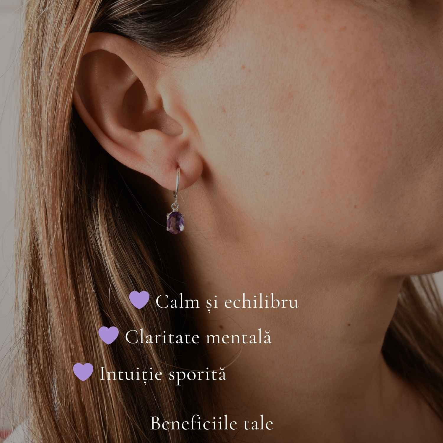 Îi porți într-o zi obișnuită și observi cum îți luminează subtil chipul. Ametistul reflectă lumina discret, iar forma ovală adaugă rafinament. Sunt cercei ușori și comozi, pe care îi vei purta fără să-i simți.