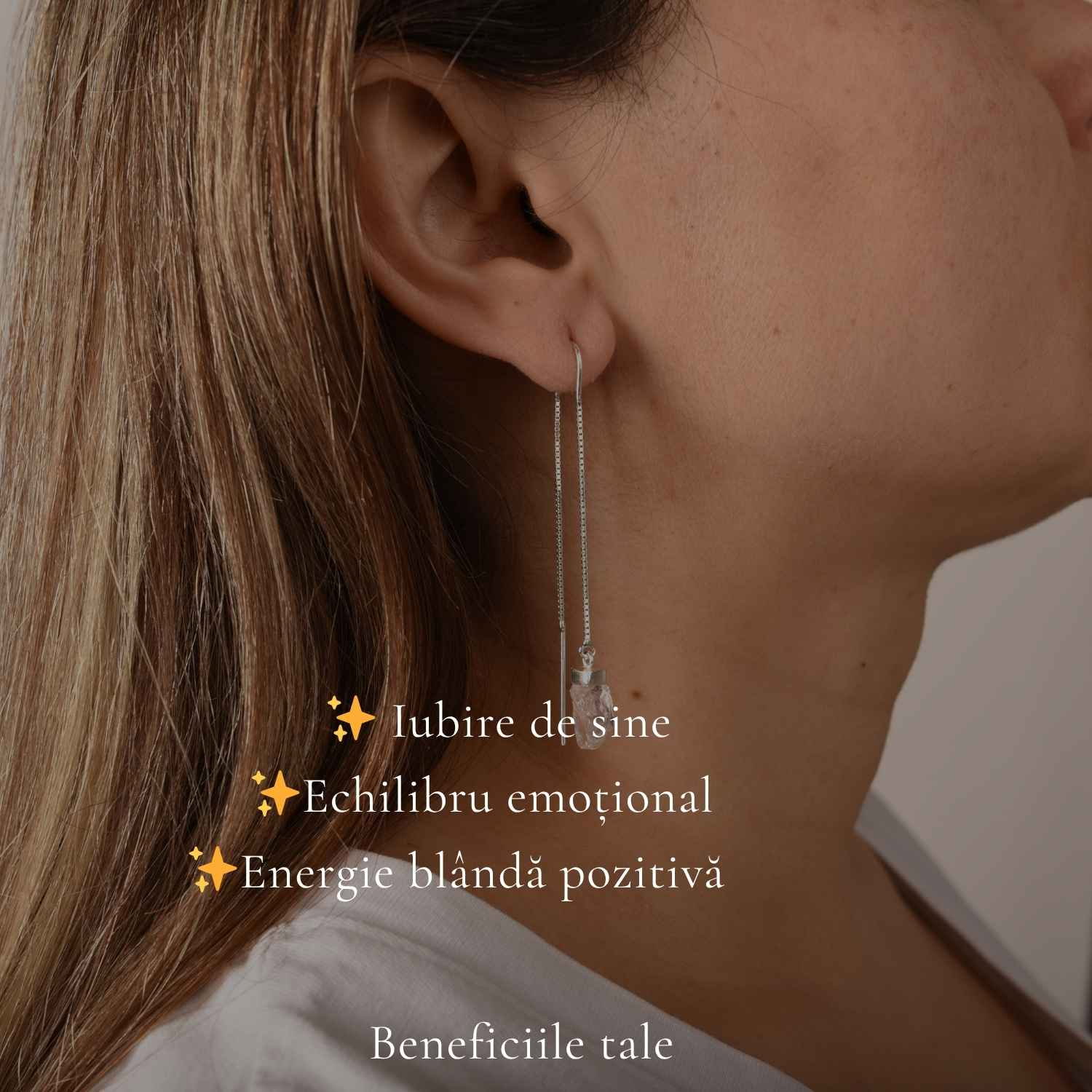 Sunt genul de cercei care spun o poveste despre tine — autentică, naturală, fără mască. Cuartul roz brut și lanțul fin creează acel echilibru între delicatețe și libertate.