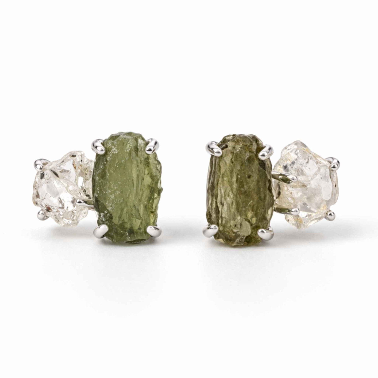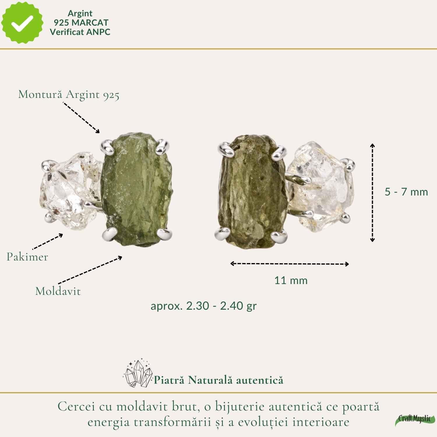 Cercei din argint 925 cu moldavit și pakimer natural, o combinație puternică pentru claritate și transformare interioară. Susțin intuiția, echilibrul energetic și te ajută să te reconectezi cu tine în momentele importante.